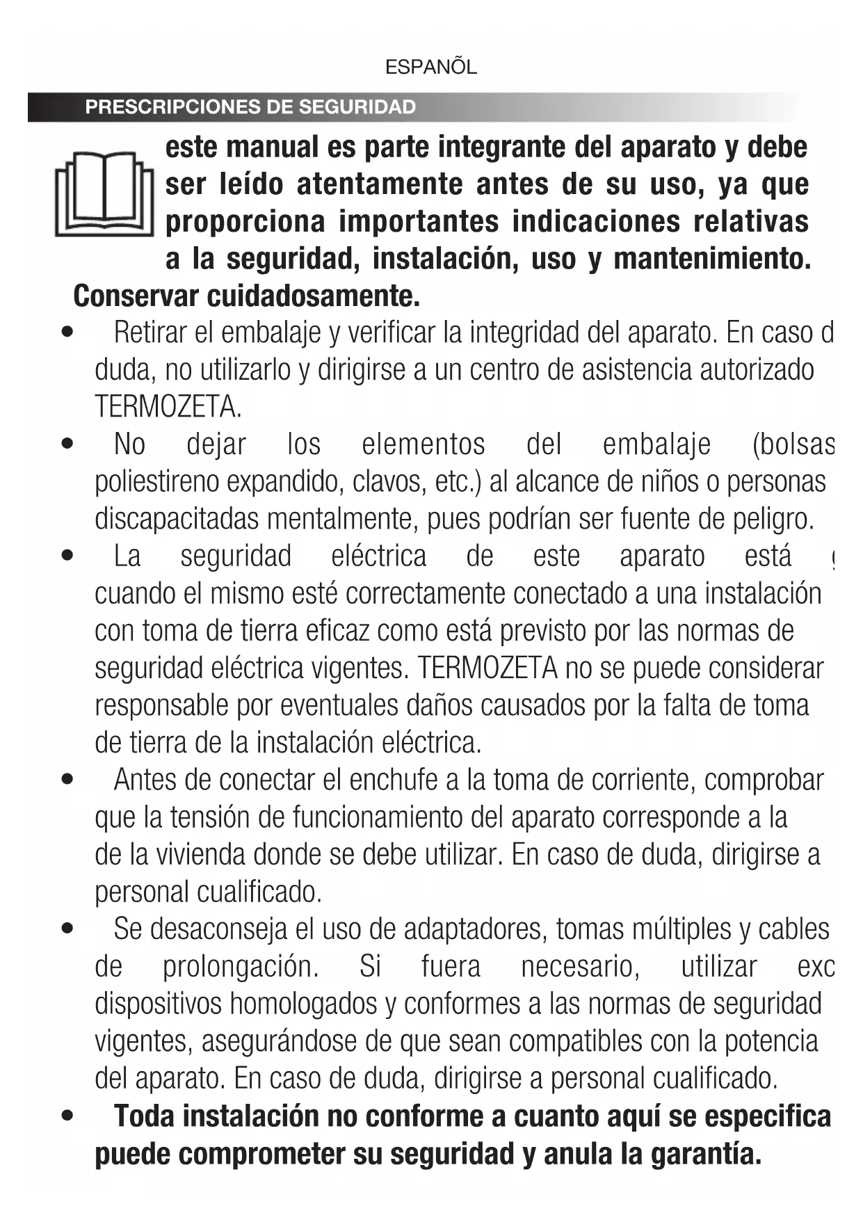 - No sustituir el cable de alimentación del aparato. Si fuera necesario, dirigirse a un centro de asistencia autorizado TERMOZETAoapersonalcualicado.ESPANÕL