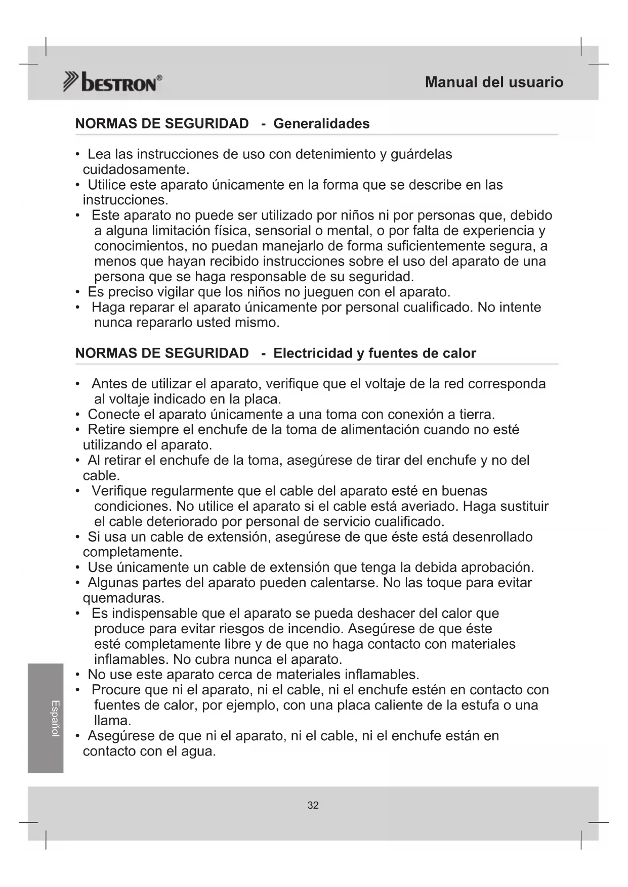 Bestron Service Moeskampweg 20 5222 AW ’s-Hertogenbosch Tel: +31(0) 73 - 623 11 21 Fax: +31(0) 73 - 621 23 96 Email: info@bestron.com Internet: www.bestron.com CERTIFICACIÓN DE CONFORMIDAD (CE) Este producto satisface las disposiciones de las siguientes directivas de la Unión Europea en el marco de la seguridad:
