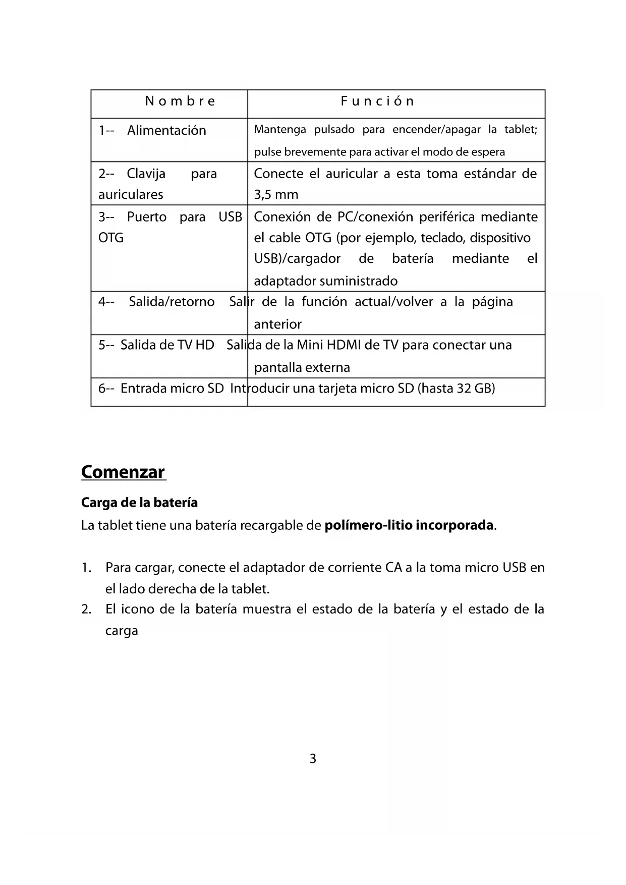 | 3-- Puerto para USB OTG | Conexión de PC/conexión periférica mediante el cable OTG (por ejemplo, teclado, dispositivo USB)/cargador de batería mediante el adaptador suministrado |