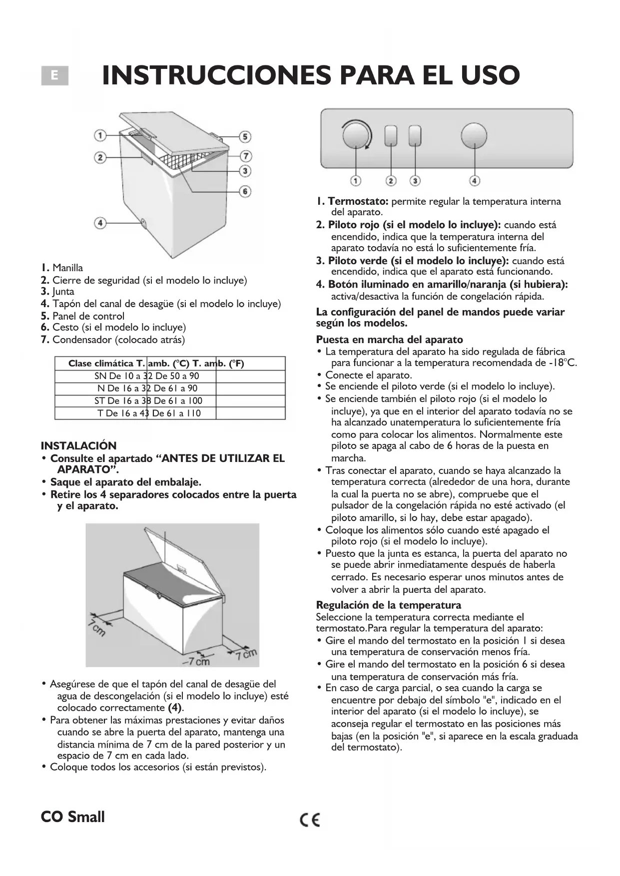 - En caso de carga parcial, o sea cuando la carga se encuentre por debajo del símbolo "e", indicado en el interior del aparato (si el modelo lo incluye), se aconseja regular el termostato en las posiciones más bajas (en la posición "e", si aparece en la escala graduada del termostato). Clase climática T. amb. (°C) T. amb. (°F) SN De 10 a 32 De 50 a 90 N De 16 a 32 De 61 a 90 ST De 16 a 38 De 61 a 100 T De 16 a 43 De 61 a 110 CO SmallINSTRUCCIONES PARA EL USO
