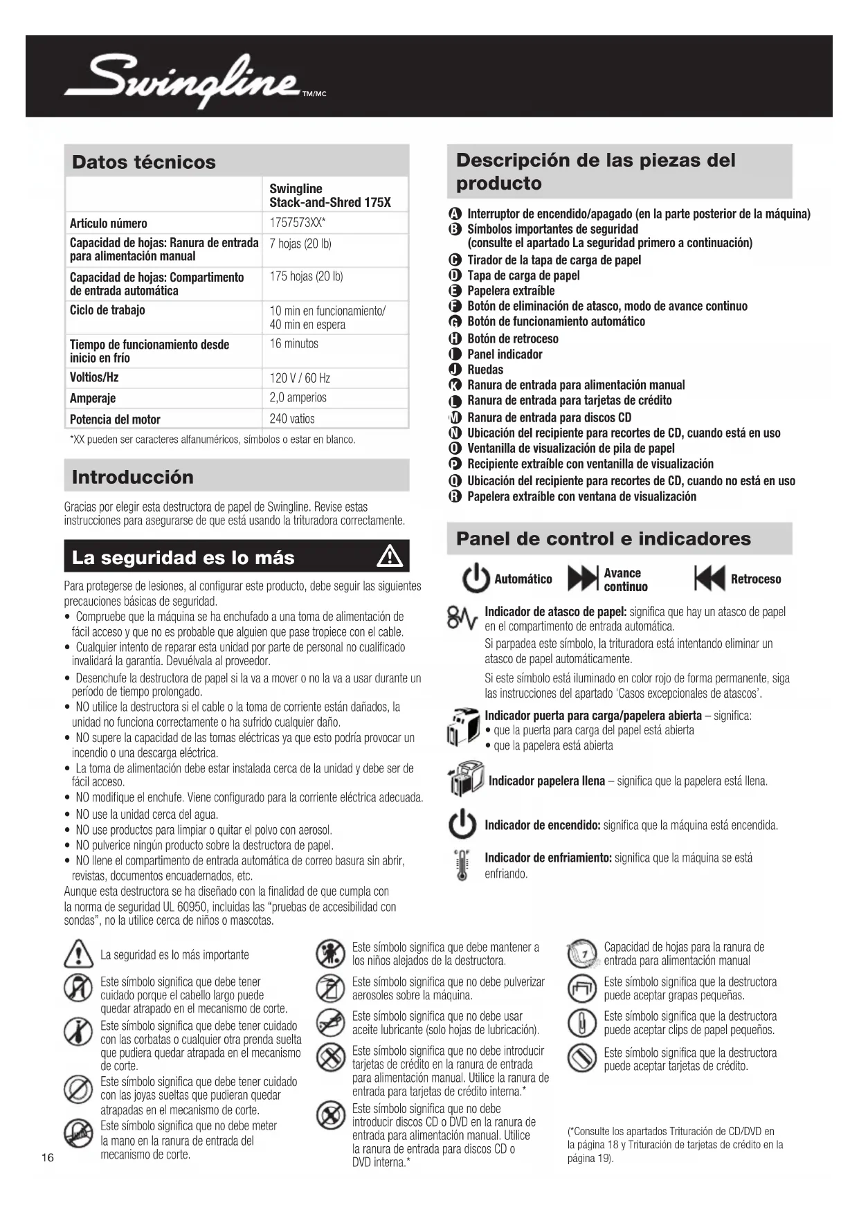 Datos técnicos Artículo número Capacidad de hojas: Ranura de entrada para alimentación manual Capacidad de hojas: Compartimento de entrada automática Ciclo de trabajo Tiempo de funcionamiento desde inicio en frío Voltios/Hz Amperaje Potencia del motor Swingline Stack-and-Shred 175X 1757573XX* 7 hojas (20 lb) 175 hojas (20 lb) 10 min en funcionamiento/ 40 min en espera 16 minutos 120 V / 60 Hz 2,0 amperios 240 vatios *XX pueden ser caracteres alfanuméricos, símbolos o estar en blanco. Retroceso Avance continuo Automático Panel de control e indicadores Indicador de encendido: signica que la máquina está encendida. Indicador de enfriamiento: signica que la máquina se está enfriando. Indicador de atasco de papel: signica que hay un atasco de papel en el compartimento de entrada automática. Si parpadea este símbolo, la trituradora está intentando eliminar un atasco de papel automáticamente. Si este símbolo está iluminado en color rojo de forma permanente, siga las instrucciones del apartado ‘Casos excepcionales de atascos’. Indicador puerta para carga/papelera abierta – signica: