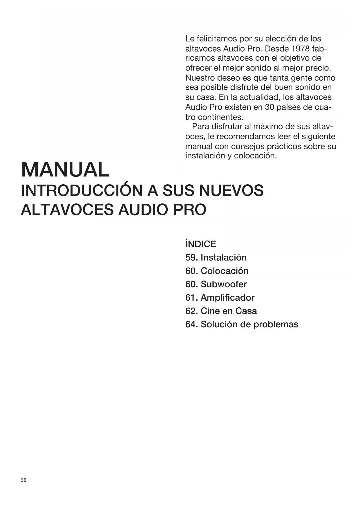 ricamos altavoces con el objetivo de ofrecer el mejor sonido al mejor precio. Nuestro deseo es que tanta gente como sea posible disfrute del buen sonido en su casa. En la actualidad, los altavoces Audio Pro existen en 30 países de cua- tro continentes. Para disfrutar al máximo de sus altav- oces, le recomendamos leer el siguiente manual con consejos prácticos sobre su instalación y colocación. ÍNDICE