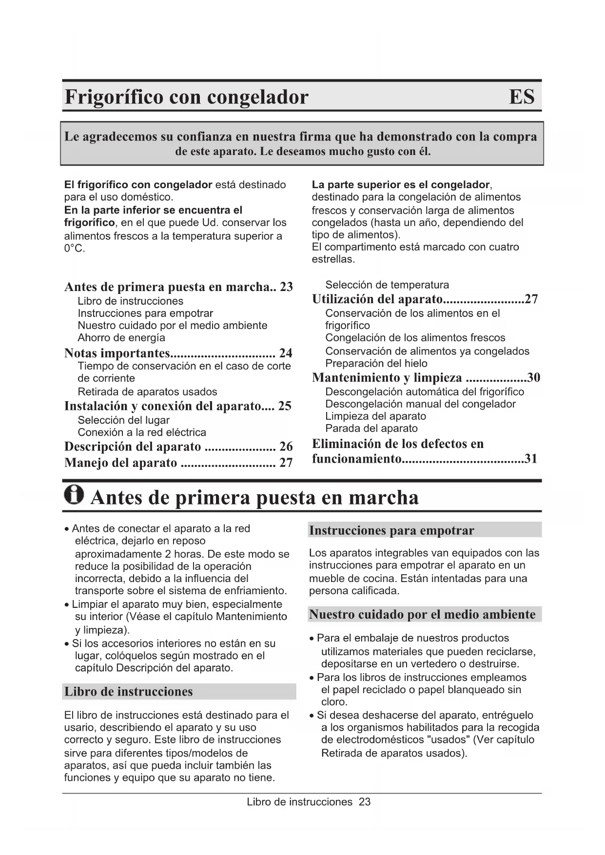 Mantequilla +++++++===== Huevos ++++++++++==== Carne: cruda en trozos + + = cruda picada + = ahumada ++++++++++==== Pescado + = Adobos ++++++++++==== Vegetales de raíces ++++++++====== Queso ++++========== Dulces ++==== Frutas ++======== Alimentos cocidos ++== + tiempo recomendable de conservación = tiempo posible de conservación Congelación de los alimentos frescos x Congele sólo los alimentos adecuados para ser conservados a bajas temperaturas. Emplee sólo los alimentos frescos y de buena calidad. x Use el embalaje adecuado y envase los alimentos correctamente. El embalaje no debe permitir el aire y humedad, previniendo de este modo la desecación de comidas y la pérdida de vitaminas. Los folios y bolsas deben ser blandos y flexibles para ajustarse bien al contenido. x Marcar los envases con los datos sobre el tipo y cantidad de alimentos, como también con la fecha de congelación. x Procure que los alimentos se congelen muy rapidamente. Por eso, proponemos use los envases no demasiado grandes y enfríe los alimentos antes de congelar. x La cantidad de alimentos frescos que Ud. puede introducir a la vez durante el período de 24 horas, está indicada en la placa de características (capacidad de congelación). Si sobrepasa esta cantidad, empeorá la calidad de congelación, como también la calidad de los alimentos ya congelados. Procedimiento de congelación congelación x En el modelo del aparato sin interruptor para refrigeración intensiva hay que girar el botón del termostato a la posición 4-7 24 horas antes de la congelación. Después de este tiempo ponga los víveres frescos en la estante víveres frescos en el congelador gire el botón del termostato a la temperatura de trabajo (vea capítulo Seleción de Temperatura) y ponga los alimentos ya congelados en las cestas. x En el modelo con interruptor para refrigeración intensiva conecte el interruptor mencionado y gire el botón del termostato a la posición 4-7 24 horas antes de iniciar la congelación des grandes cantidades de víveres. Después de 24 horas introduzca los víveres en el congelador y después de otras 24 horas desconecte el interruptor y gire el el botón del termostatoLibro de instrucciones 29 a la posición deseada (vea capítulo Selección de Temperatura). Cuando la designación (I), o bien, la designación de color es visible, el interruptor está encendido. Cuando el interruptor senala la designación (0)o la designación de color no es visible, el interruptor está desconectado (incluido en solamente algunos modelos). x Para congelaciones posteriores repita el procedimiento de la congelación. Los víveres frescos no deben tocar las envolturas ya congeladas. x Para congelar pequeñas cantidades (hasta 1 kg) no es necesario cambiar la posición del botón del termostato (vea el capítulo Selección de Temperatura). Conservación de alimentos ya congelados Puede conservar los alimentos congelados en las cestas. Si Ud. quiera, puede sacar las cestas y colocar los alimentos sobre las parillas de congelación. Para permitir la circulación del aire frío, no coloque la comida por encima de la línea indicada – vea la imagen abajo(sólo en algunos modelos). Conservación de alimentos congelados comprados La duración y la temperatura de congelación están indicadas en el envase de los alimentos. Debe tomar en cuenta las instrucciones del fabricante para la congelación. Elija sólo los alimentos envasados apropiadamente y equipados de datos completos y conservados en el congelador con la temperatura no menor de -18°C. No compre los alimentos escarchados porque estos alimentos han sido descongelados varias veces. Proteja los alimentos contra la descongelación porque el aumento de la temperatura corta el tiempo de conservación y deteriora el valor nutritivo de los alimentos. Tiempo aproximado de conservación de los alimentos congelados Alomento Tiempo de conservación (en meses)