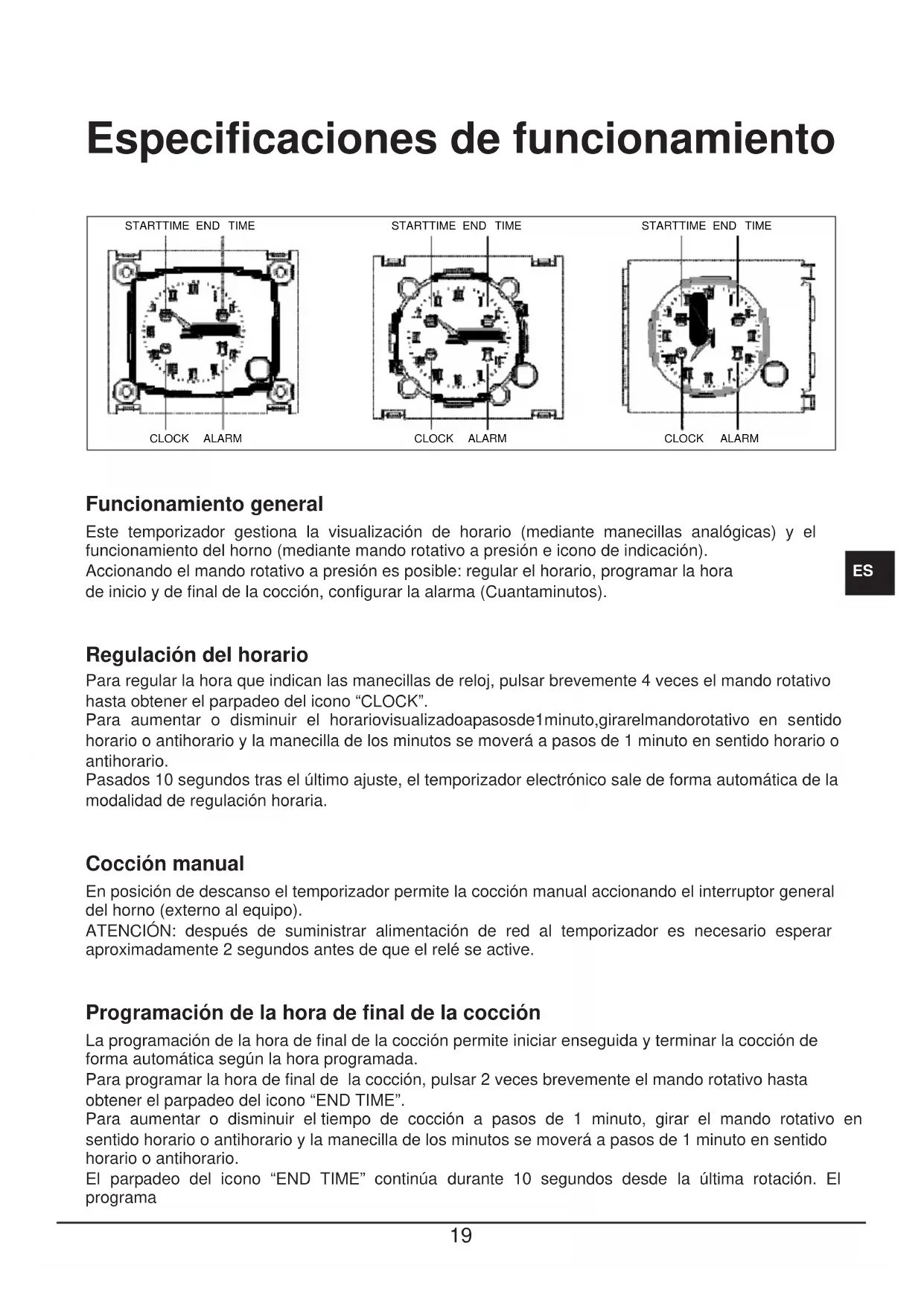 Funcionamiento general Este temporizador gestiona la visualización de horario (mediante manecillas analógicas) y el funcionamiento del horno (mediante mando rotativo a presión e icono de indicación). Accionando el mando rotativo a presión es posible: regular el horario, programar la hora