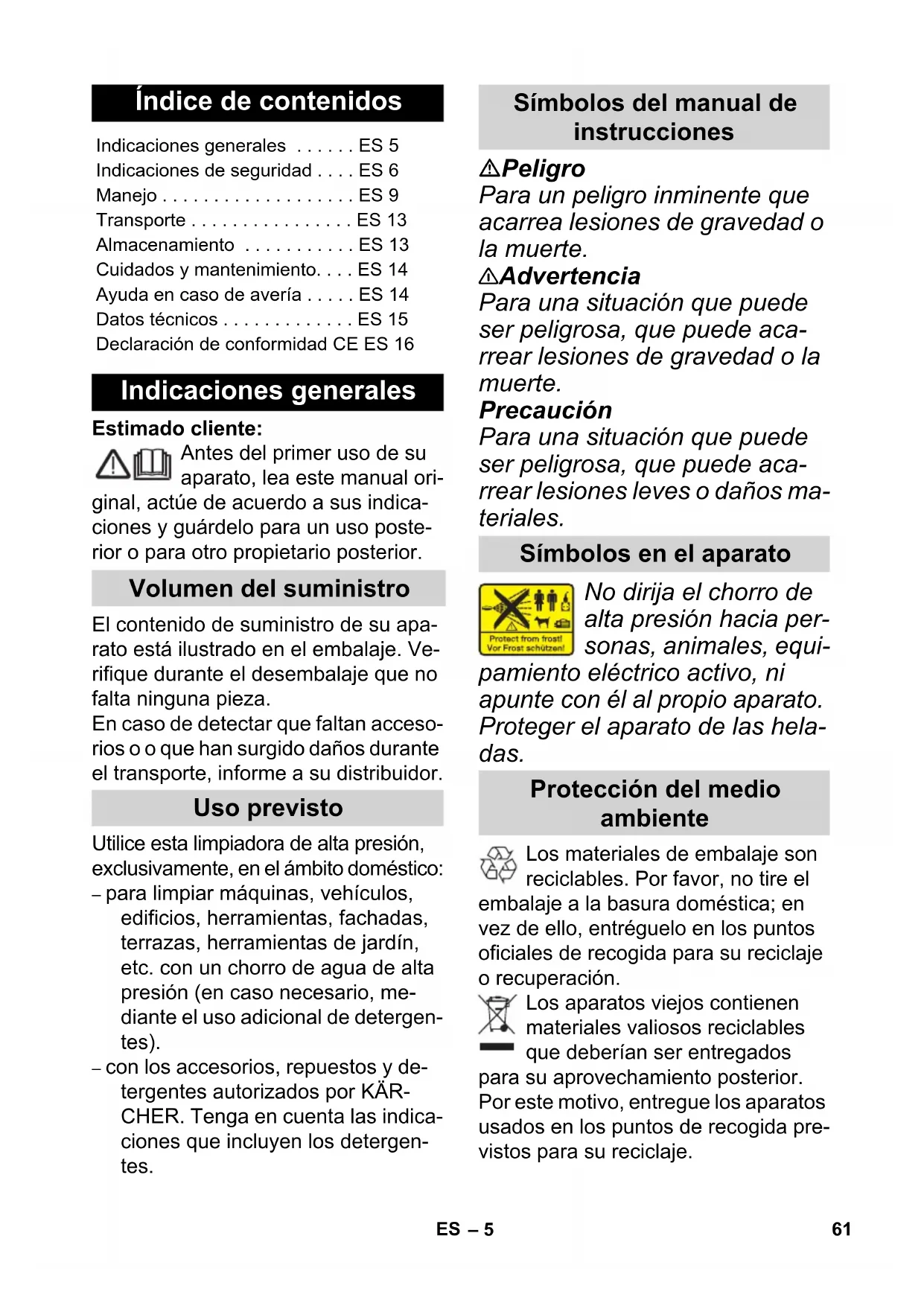 EN 61000–3–3: 2008 EN 62233: 2008 Toegepaste conformiteitsbeoorde- lingsprocedure 2000/14/EG: Bijlage V Geluidsvermogensniveau dB(A) Gemeten: 87 Gegarandeerd:90 Winnenden, 2013/07/01 CEO Head of Approbation 60 NL– 5 Estimado cliente: Antes del primer uso de su aparato, lea este manual ori- ginal, actúe de acuerdo a sus indica- ciones y guárdelo para un uso poste- rior o para otro propietario posterior. El contenido de suministro de su apa- rato está ilustrado en el embalaje. Ve- rifique durante el desembalaje que no falta ninguna pieza. En caso de detectar que faltan acceso- rios o o que han surgido daños durante el transporte, informe a su distribuidor. Utilice esta limpiadora de alta presión, exclusivamente, en el ámbito doméstico: – para limpiar máquinas, vehículos, edificios, herramientas, fachadas, terrazas, herramientas de jardín, etc. con un chorro de agua de alta presión (en caso necesario, me- diante el uso adicional de detergen- tes). – con los accesorios, repuestos y de- tergentes autorizados por KÄR- CHER. Tenga en cuenta las indica- ciones que incluyen los detergen- tes. Peligro Para un peligro inminente que acarrea lesiones de gravedad o la muerte. 몇 Advertencia Para una situación que puede ser peligrosa, que puede aca- rrear lesiones de gravedad o la muerte. Precaución Para una situación que puede ser peligrosa, que puede aca- rrear lesiones leves o daños ma- teriales. No dirija el chorro de alta presión hacia per- sonas, animales, equi- pamiento eléctrico activo, ni apunte con él al propio aparato. Proteger el aparato de las hela- das. Los materiales de embalaje son reciclables. Por favor, no tire el embalaje a la basura doméstica; en vez de ello, entréguelo en los puntos oficiales de recogida para su reciclaje o recuperación. Los aparatos viejos contienen materiales valiosos reciclables que deberían ser entregados para su aprovechamiento posterior. Por este motivo, entregue los aparatos usados en los puntos de recogida pre- vistos para su reciclaje. Índice de contenidos Indicaciones generales . . . . . . ES 5 Indicaciones de seguridad . . . . ES 6 Manejo . . . . . . . . . . . . . . . . . . . ES 9 Transporte . . . . . . . . . . . . . . . . ES 13 Almacenamiento . . . . . . . . . . . ES 13 Cuidados y mantenimiento. . . . ES 14 Ayuda en caso de avería . . . . . ES 14 Datos técnicos . . . . . . . . . . . . . ES 15 Declaración de conformidad CE ES 16 Indicaciones generales Volumen del suministro Uso previsto Símbolos del manual de instrucciones Símbolos en el aparato Protección del medio ambiente 61ES– 6 Indicaciones sobre ingredientes (REACH) Encontrará información actual sobre los ingredientes en: www.kaercher.com/REACH En todos los países rigen las condicio- nes de garantía establecidas por nues- tra empresa distribuidora. Las averías del aparato serán subsanadas gratui- tamente dentro del periodo de garan- tía, siempre que se deban a defectos de material o de fabricación. En un caso de garantía, le rogamos que se dirija con el comprobante de compra al distribuidor donde adquirió el aparato o al servicio al cliente autorizado más próximo a su domicilio. (La dirección figura al dorso) Peligro No toque nunca el enchufe de red o la toma de corriente con las manos mojadas. No ponga el aparato en fun- cionamiento si el cable de co- nexión a red u otras partes importantes del aparato, como pueden ser la mangue- ra de alta presión, la pistola pulverizadora o los dispositi- vos de seguridad presentan daños. Antes de cada puesta en ser- vicio, compruebe si el cable de conexión a red y el enchu- fe de red presentan daños. Si el cable de conexión a red es- tuviera deteriorado, debe en- cargar sin demora a un elec- tricista especializado del ser- vicio de atención al cliente autorizado que lo sustituya. Antes de cada puesta en servi- cio, compruebe si la manguera de alta presión presenta da- ños. Si la manguera de alta presión presentase daños, debe sustituirla sin demora. Está prohibido usar el apara- to en zonas en las que exista riesgo de explosiones. Para usar el aparato en zo- nas con peligro de explosión (p. ej., gasolineras) son de obligado cumplimiento las normas de seguridad corres- pondientes. Los chorros a alta presión pueden ser peligrosos si se usan indebidamente. No diri- ja el chorro hacia personas, animales o equipamiento eléctrico activo, ni apunte con él al propio aparato. No dirija el chorro hacia otras personas o hacia sí mismo para limpiar ropa o calzado. No rocíe objetos que puedan contener sustancias nocivas para la salud (p. ej., asbesto). El chorro a alta presión puede dañar los neumáticos del ve- hículo y sus válvulas y los puede reventar. Un primer síntoma de que se están pro- vocando daños es el cambio de tonalidad de los neumáti- cos. Los neumáticos de vehí- culo y las válvulas de neumá- ticos deteriorados suponen un peligro mortal. Garantía Indicaciones de seguridad 62 ES– 7 Al efectuar la limpieza, apli- que el chorro a una distancia mínima de 30 cm. Peligro de explosiones No pulverizar ningun líquido inflamable. No aspire nunca líquidos que contengan disolventes o áci- dos y disolventes sin diluir. Entre estos se encuentran, p. ej., la gasolina, los diluyentes cromáticos o el fuel. La nebli- na pulverizada es altamente inflamable, explosiva y tóxi- ca. No utilice acetona ni áci- dos o disolventes sin diluir, ya que pueden afectar negativa- mente a los materiales em- pleados en el aparato. 몇 Advertencia El enchufe y el acoplamiento de un conducto de prolonga- ción tienen que ser estancos y no pueden estar dentro del agua. El acoplamiento no puede seguir en el suelo. Se recomienda utilizar enrollado- res de cables que garantizan que los enchufes estén al me- nos a 60mm del suelo. Los cables eléctricos prolon- gadores inadecuados pue- den ser peligrosos. Para el exterior, utilice solo cables de prolongación eléctricos auto- rizados expresamente para ello