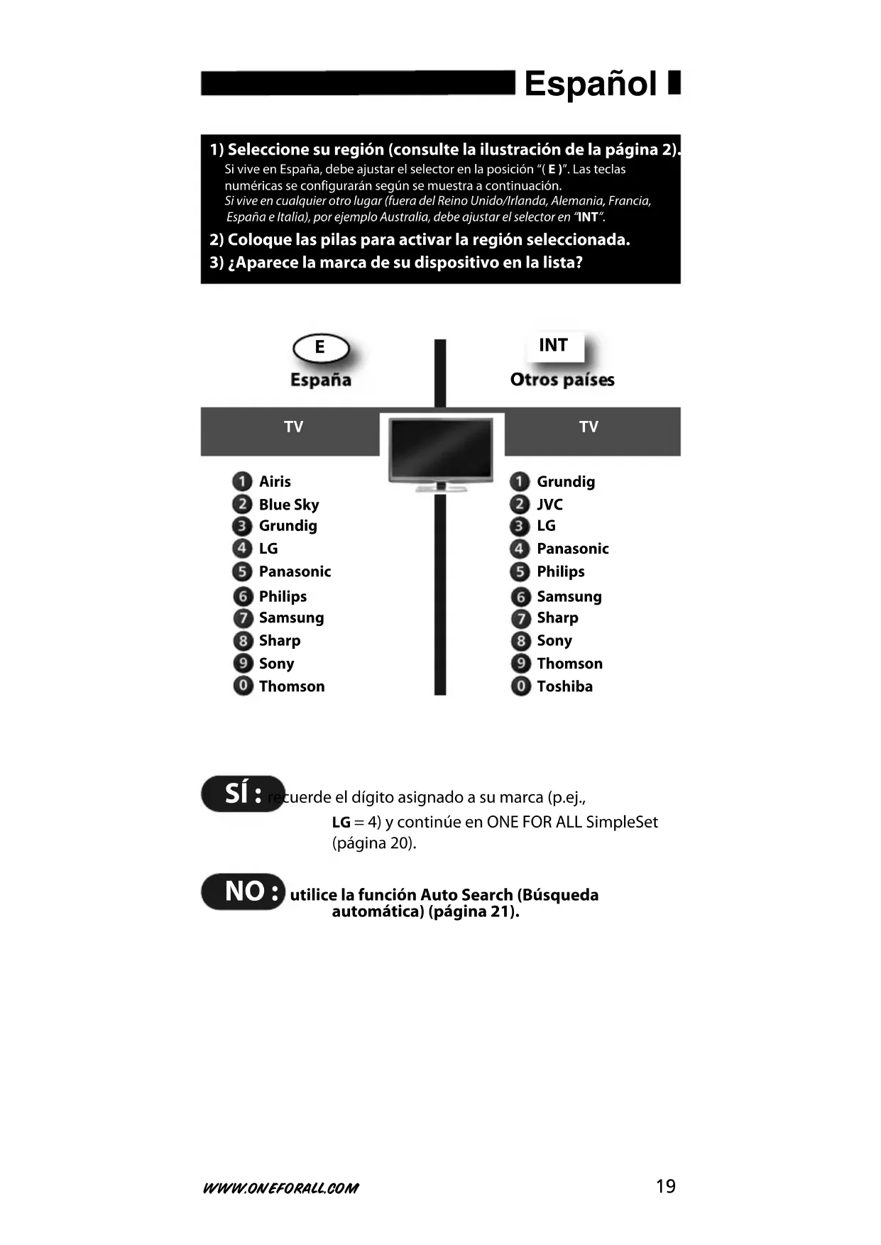 SÍ : recuerde el dígito asignado a su marca (p.ej., LG = 4) y continúe en ONE FOR ALL SimpleSet (página 20).