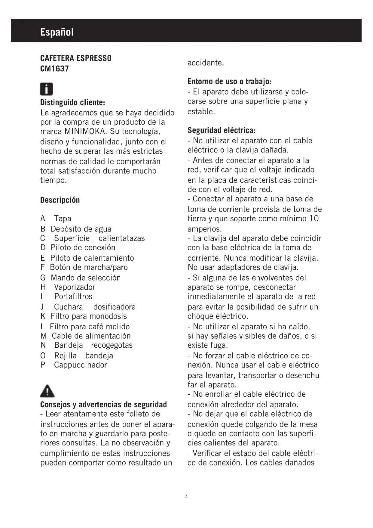 0DQXDO0LQLPRNDLQGE 1Fig.1 Fig.3 Fig.2 0DQXDO0LQLPRNDLQGE 2Español CAFETERA ESPRESSO CM1637 Distinguido cliente: Le agradecemos que se haya decidido por la compra de un producto de la marca MINIMOKA. Su tecnología, diseño y funcionalidad, junto con el hecho de superar las más estrictas normas de calidad le comportarán total satisfacción durante mucho tiempo. Descripción A Tapa B Depósito de agua C Superficie calientatazas D Piloto de conexión E Piloto de calentamiento F Botón de marcha/paro G Mando de selección H Vaporizador I Portafiltros J Cuchara dosificadora K Filtro para monodosis L Filtro para café molido M Cable de alimentación N Bandeja recogegotas O Rejilla bandeja P Cappuccinador Consejos y advertencias de seguridad - Leer atentamente este folleto de instrucciones antes de poner el apara- to en marcha y guardarlo para poste- riores consultas. La no observación y cumplimiento de estas instrucciones pueden comportar como resultado un accidente. Entorno de uso o trabajo: - El aparato debe utilizarse y colo- carse sobre una superficie plana y estable. Seguridad eléctrica: - No utilizar el aparato con el cable eléctrico o la clavija dañada. - Antes de conectar el aparato a la red, verificar que el voltaje indicado en la placa de características coinci- de con el voltaje de red. - Conectar el aparato a una base de toma de corriente provista de toma de tierra y que soporte como mínimo 10 amperios. - La clavija del aparato debe coincidir con la base eléctrica de la toma de corriente. Nunca modificar la clavija. No usar adaptadores de clavija. - Si alguna de las envolventes del aparato se rompe, desconectar inmediatamente el aparato de la red para evitar la posibilidad de sufrir un choque eléctrico. - No utilizar el aparato si ha caído, si hay señales visibles de daños, o si existe fuga. - No forzar el cable eléctrico de co- nexión. Nunca usar el cable eléctrico para levantar, transportar o desenchu- far el aparato. - No enrollar el cable eléctrico de conexión alrededor del aparato. - No dejar que el cable eléctrico de conexión quede colgando de la mesa o quede en contacto con las superfi- cies calientes del aparato. - Verificar el estado del cable eléctri- co de conexión. Los cables dañados 0DQXDO0LQLPRNDLQGE 3o enredados aumentan el riesgo de choque eléctrico. - No tocar la clavija de conexión con las manos mojadas. Utilización y cuidados: - No usar el aparato si los accesorios o consumibles no están debidamente acoplados. - No poner el aparato en marcha sin agua. - No usar el aparato si su dispositivo de puesta en marcha/paro no funciona. - No mover o desplazar el aparato mientras esté en funcionamiento. - Respetar los niveles marcado en el depósito de agua. - Desenchufar el aparato de la red cuando no se use y antes de realizar cualquier operación de limpieza. - Este aparato está pensado única- mente para un uso doméstico, no para uso profesional o industrial. - Este aparato no es un juguete. Los niños deben estar bajo vigilancia para asegurar que no jueguen con el aparato. - Este aparato está pensado para que lo usen adultos. No permitir que lo usen personas no familiarizadas con este tipo de producto, personas disca- pacitadas o niños. - Guardar este aparato fuera del alcance de los niños y/o personas discapacitadas. - No guardar ni transportar el aparato si todavía está caliente. - Toda utilización inadecuada, o en desacuerdo con las instrucciones de uso, puede comportar peligro, anulan- do la garantía y la responsabilidad del fabricante. Modo de empleo Uso: - Desenrollar completamente el cable antes de enchufar. - Enchufar el aparato a la red eléctrica. Esta simple operación asegura un sumi- nistro óptimo y debe ser realizada: -En la primera puesta en marcha; -Cuando la máquina permanece un largo periodo sin usarse (1 ó 2 semanas) -Después de hacer vapor -Cuando el depósito se ha quedado sin agua. -Pulse el interruptor marcha/paro, quedara conectada la máquina. -Enjuagar el depósito y llenarlo con agua potable fresca. -Colocar un recipiente debajo vapori- zador. Seleccionar la salida vapor. -Seleccionar la salida de café, saldrá agua por el vaporizador espere a que salga una capacidad aproximada de una taza. - Para terminar el suministro, rotar el mando de seleccion a la posicion central Llenado del depósito de agua: - Extraer el depósito del aparato. - Llenar el depósito con agua fría. - Llenar el depósito respetando el nivel indicado - Volver a colocar el depósito en su alojamiento, asegurándose que este debidamente encajado. 0DQXDO0LQLPRNDLQGE 4Preparación de café: -Verificar que el filtro extraíble este perfectamente colocado en el portafiltros. -Llenar el depósito con agua fría respetando el nivel indicado. -Enchufar el aparato a la red eléc- trica. - Llenar con café molido el filtro extraíble, (deben colocarse de 6-7gr de café molido por taza de café a preparar). -Si desea hacer 1 café, llene el caci- llo hasta la mitad de su capacidad (1 cucharada), tome la capacidad de la cuchara dosificadora como la medida para un café. -Para 2 cafés, ponga 2 cucharadas. -Después, prense ligeramente el café molido con la parte posterior de la cuchara. -Antes de colocar el portafiltros en el grupo de la cafetera, gira hacia atrás el sujeta-cacillo. -Fijar el portafiltro en el grupo de café introduciéndole desde abajo del grupo. -Girar el portafiltro en el grupo de café introduciéndolo desde abajo del grupo y girarlo de izquierda a derecha hasta que se bloquee. -Colocar una o dos tazas precalenta- das a la salida del portafiltros, según su elección, pulse el botón salida café. Se iniciara la salida de infusión de café.Cuando haya obtenido la cantidad deseada de café exprés (corto o largo), rotar el mando hacia la posición central. -Finalizando el suministro esperar unos segundos, retirar las tazas con el café. -Extraer el portafiltro y vaciarlo de los posos. -Lavar el portafiltro con agua co