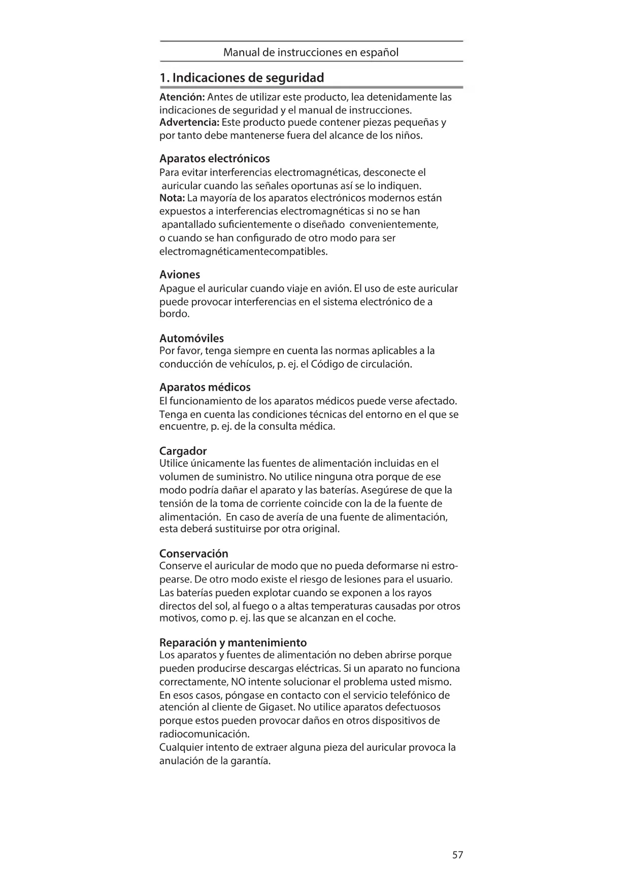Atención: Antes de utilizar este producto, lea detenidamente las indicaciones de seguridad y el manual de instrucciones. Advertencia: Este producto puede contener piezas pequeñas y por tanto debe mantenerse fuera del alcance de los niños. Aparatos electrónicos Para evitar interferencias electromagnéticas, desconecte el auricular cuando las señales oportunas así se lo indiquen. Nota: La mayoría de los aparatos electrónicos modernos están expuestos a interferencias electromagnéticas si no se han apantallado sucientemente o diseñado convenientemente, ocuando se han congurado de otro modo para ser electromagnéticamente compatibles. Aviones Apague el auricular cuando viaje en avión. El uso de este auricular puede provocar interferencias en el sistema electrónico de a bordo. Automóviles Por favor, tenga siempre en cuenta las normas aplicables a la conducción de vehículos, p. ej. el Código de circulación. Aparatos médicos El funcionamiento de los aparatos médicos puede verse afectado. Tenga en cuenta las condiciones técnicas del entorno en el que se encuentre, p. ej. de la consulta médica. Cargador Utilice únicamente las fuentes de alimentación incluidas en el volumen de suministro. No utilice ninguna otra porque de ese modo podría dañar el aparato y las baterías. Asegúrese de que la tensión de la toma de corriente coincide con la de la fuente de alimentación. En caso de avería de una fuente de alimentación, esta deberá sustituirse por otra original. Conservación Conserve el auricular de modo que no pueda deformarse ni estro- pearse. De otro modo existe el riesgo de lesiones para el usuario. Las baterías pueden explotar cuando se exponen a los rayos directos del sol, al fuego o a altas temperaturas causadas por otros motivos, como p. ej. las que se alcanzan en el coche. Reparación y mantenimiento Los aparatos y fuentes de alimentación no deben abrirse porque pueden producirse descargas eléctricas. Si un aparato no funciona correctamente, NO intente solucionar el problema usted mismo. En esos casos, póngase en contacto con el servicio telefónico de atención al cliente de Gigaset. No utilice aparatos defectuosos porque estos pueden provocar daños en otros dispositivos de radiocomunicación. Cualquier intento de extraer alguna pieza del auricular provoca la anulación de la garantía. _A31008-N1163-R101-1-X119_ZX830-S.indd 57 02.12.13 0958