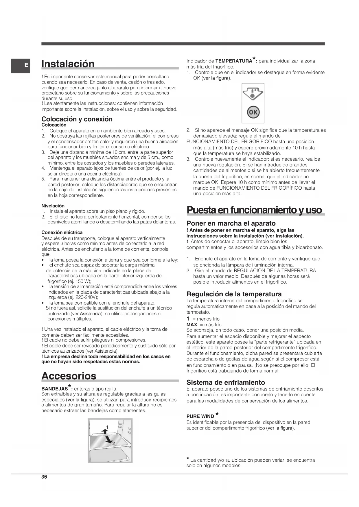 - latomaposealaconexiónatierrayqueseaconformealaley;• elenchufeseacapazdesoportarlacargamáxima depotenciadelamáquinaindicadaenlaplacadecaracterísticasubicadaenlaparteinferiorizquierdadelfrigorífico(ej.150W);• latensióndealimentaciónestécomprendidaentrelosvaloresindicadosenlaplacadecaracterísticasubicadaabajoalaizquierda(ej.220-240V);• latomaseacompatibleconelenchufedelaparato. Sinofueraasí,solicitelasustitucióndelenchufeauntécnicoautorizado(ver Asistencia);noutiliceprolongacionesniconexionesmúltiples.!Unavezinstaladoelaparato,elcableeléctricoylatomadecorrientedebenserfácilmenteaccesibles.!Elcablenodebesufrirplieguesnicompresiones.!Elcabledebeserrevisadoperiódicamenteysustituidosóloportécnicosautorizados(verAsistencia).! La empresa declina toda responsabilidad en los casos en que no hayan sido respetadas estas normas. Accesorios BANDEJAS*: enteras o tipo rejilla. Sonextraíblesysualturaesregulablegraciasalasguíasespeciales (ver la figura),seutilizanparaintroducirrecipientesoalimentosdegrantamaño.Pararegularlaalturanoesnecesarioextraerlasbandejascompletamentes.IndicadordeTEMPERATURA*:paraindividualizarlazonamásfríadelfrigorífico.1. ControlequeenelindicadorsedestaqueenformaevidenteOK(ver la figura).2. SinoapareceelmensajeOKsignificaquelatemperaturaesdemasiadoelevada:reguleelmandodeFUNCIONAMIENTODELFRIGORÍFICOhastaunaposiciónmásalta(másfrío)yespereproximadamente10hhastaquelatemperaturasehayaestabilizado.3. Controlenuevamenteelindicador:siesnecesario,realiceunanuevaregulación.Sisehanintroducidograndescantidadesdealimentososisehaabiertofrecuentementelapuertadelfrigorífico,esnormalqueelindicadornomarqueOK.Espere10hcomomínimoantesdellevarelmandodeFUNCIONAMIENTODELFRIGORÍFICOhastaunaposiciónmásalta. Puesta en funcionamiento y uso Poner en marcha el aparato ! Antes de poner en marcha el aparato, siga las instrucciones sobre la instalación (ver Instalación).!Antesdeconectarelaparato,limpiebienloscompartimientosylosaccesoriosconaguatibiaybicarbonato.1. Enchufeelaparatoenlatomadecorrienteyverifiquequeseenciendalalámparadeiluminacióninterna.2. GireelmandodeREGULACIÓNDELATEMPERATURAhastaunvalormedio.Despuésdealgunashorasseráposibleintroduciralimentosenelfrigorífico. Regulación de la temperatura Latemperaturainternadelcompartimentofrigoríficoseregulaautomáticamenteenbasealaposicióndelmandodeltermostato. 1 =menosfrío MAX=másfríoSeaconseja,entodocaso,ponerunaposiciónmedia.Paraaumentarelespaciodisponibleymejorarelaspectoestético,esteaparatoposeela“parterefrigerante”ubicadaenelinteriordelaparedposteriordelcompartimentofrigorífico.Duranteelfuncionamiento,dichaparedsepresentarácubiertadeescarchaodegotitasdeaguasegúnsielcompresorestáenfuncionamientooenpausa.¡Nosepreocupeporello!Elfrigoríficoestátrabajandodeformanormal. Sistema de enfriamiento Elaparatoposeeunodelossistemasdeenfriamientodescritosacontinuación:esimportanteconocerloytenerloencuentaparalasmodalidadesdeconservacióndelosalimentos.PURE WIND Esidentificableporlapresenciadeldispositivoenlaparedsuperiordelcompartimentofrigorífico(ver la figura). *Lacantidady/osuubicaciónpuedenvariar,seencuentra soloenalgunosmodelos.E