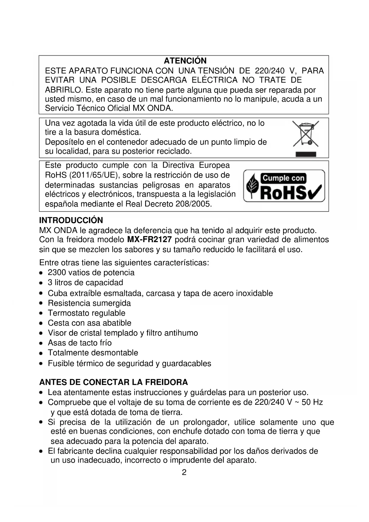 ANTES DE SU USO LEA ATENTAMENTE ESTE MANUAL2 ATENCIÓN ESTE APARATO FUNCIONA CON UNA TENSIÓN DE 220/240 V, PARA EVITAR UNA POSIBLE DESCARGA ELÉCTRICA NO TRATE DE ABRIRLO. Este aparato no tiene parte alguna que pueda ser reparada por usted mismo, en caso de un mal funcionamiento no lo manipule, acuda a un Servicio Técnico Oficial MX ONDA. Una vez agotada la vida útil de este producto eléctrico, no lo tire a la basura doméstica. Deposítelo en el contenedor adecuado de un punto limpio de su localidad, para su posterior reciclado. Este producto cumple con la Directiva Europea RoHS (2011/65/UE), sobre la restricción de uso de determinadas sustancias peligrosas en aparatos eléctricos y electrónicos, transpuesta a la legislación española mediante el Real Decreto 208/2005. INTRODUCCIÓN MX ONDA le agradece la deferencia que ha tenido al adquirir este producto. Con la freidora modelo MX-FR2127 podrá cocinar gran variedad de alimentos sin que se mezclen los sabores y su tamaño reducido le facilitará el uso. Entre otras tiene las siguientes características: 2300 vatios de potencia 3 litros de capacidad Cuba extraíble esmaltada, carcasa y tapa de acero inoxidable Resistencia sumergida Termostato regulable Cesta con asa abatible Visor de cristal templado y filtro antihumo Asas de tacto frío Totalmente desmontable Fusible térmico de seguridad y guardacables