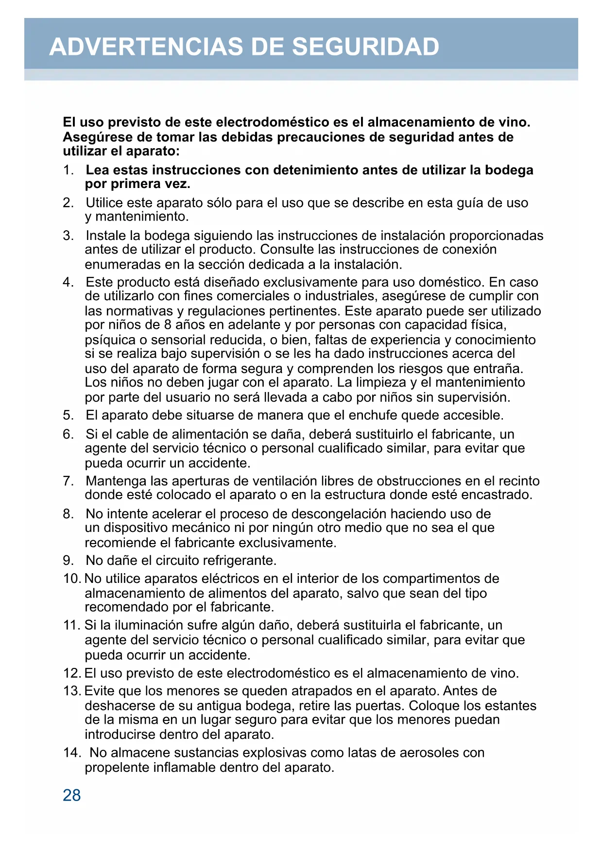 1. Lea estas instrucciones con detenimiento antes de utilizar la bodega
