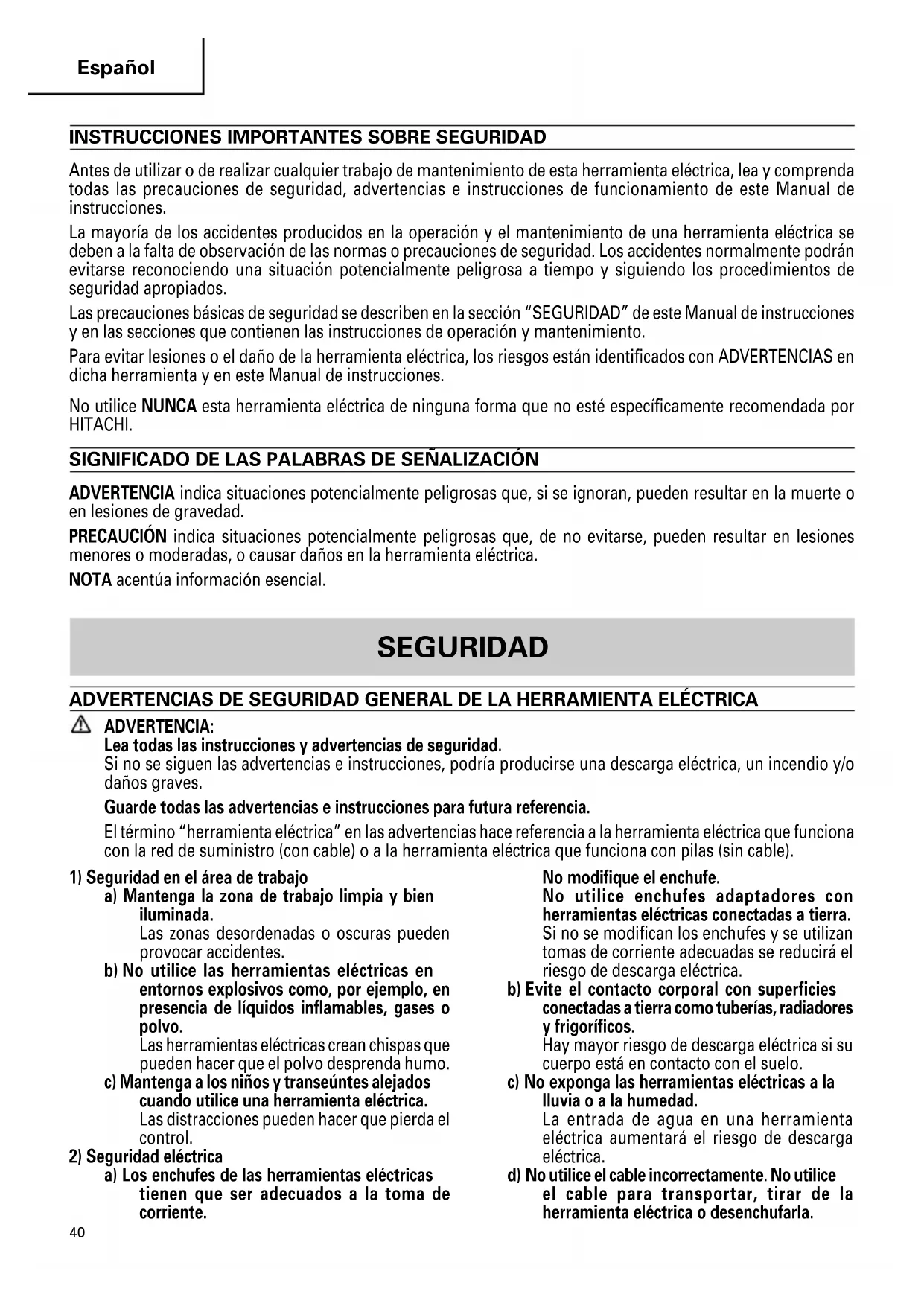 Antes de utilizar o de realizar cualquier trabajo de mantenimiento de esta herramienta eléctrica, lea y comprenda todas las precauciones de seguridad, advertencias e instrucciones de funcionamiento de este Manual de instrucciones. La mayoría de los accidentes producidos en la operación y el mantenimiento de una herramienta eléctrica se deben a la falta de observación de las normas o precauciones de seguridad. Los accidentes normalmente podrán evitarse reconociendo una situación potencialmente peligrosa a tiempo y siguiendo los procedimientos de seguridad apropiados. Las precauciones básicas de seguridad se describen en la sección “SEGURIDAD” de este Manual de instrucciones y en las secciones que contienen las instrucciones de operación y mantenimiento. Para evitar lesiones o el daño de la herramienta eléctrica, los riesgos están identificados con ADVERTENCIAS en dicha herramienta y en este Manual de instrucciones. No utilice NUNCA esta herramienta eléctrica de ninguna forma que no esté específicamente recomendada por HITACHI. SIGNIFICADO DE LAS PALABRAS DE SEÑALIZACIÓN ADVERTENCIA indica situaciones potencialmente peligrosas que, si se ignoran, pueden resultar en la muerte o en lesiones de gravedad. PRECAUCIÓN indica situaciones potencialmente peligrosas que, de no evitarse, pueden resultar en lesiones menores o moderadas, o causar daños en la herramienta eléctrica. NOTA acentúa información esencial. SEGURIDAD ADVERTENCIAS DE SEGURIDAD GENERAL DE LA HERRAMIENTA ELÉCTRICA ADVERTENCIA: Lea todas las instrucciones y advertencias de seguridad. Si no se siguen las advertencias e instrucciones, podría producirse una descarga eléctrica, un incendio y/o daños graves. Guarde todas las advertencias e instrucciones para futura referencia. El término “herramienta eléctrica” en las advertencias hace referencia a la herramienta eléctrica que funciona con la red de suministro (con cable) o a la herramienta eléctrica que funciona con pilas (sin cable).