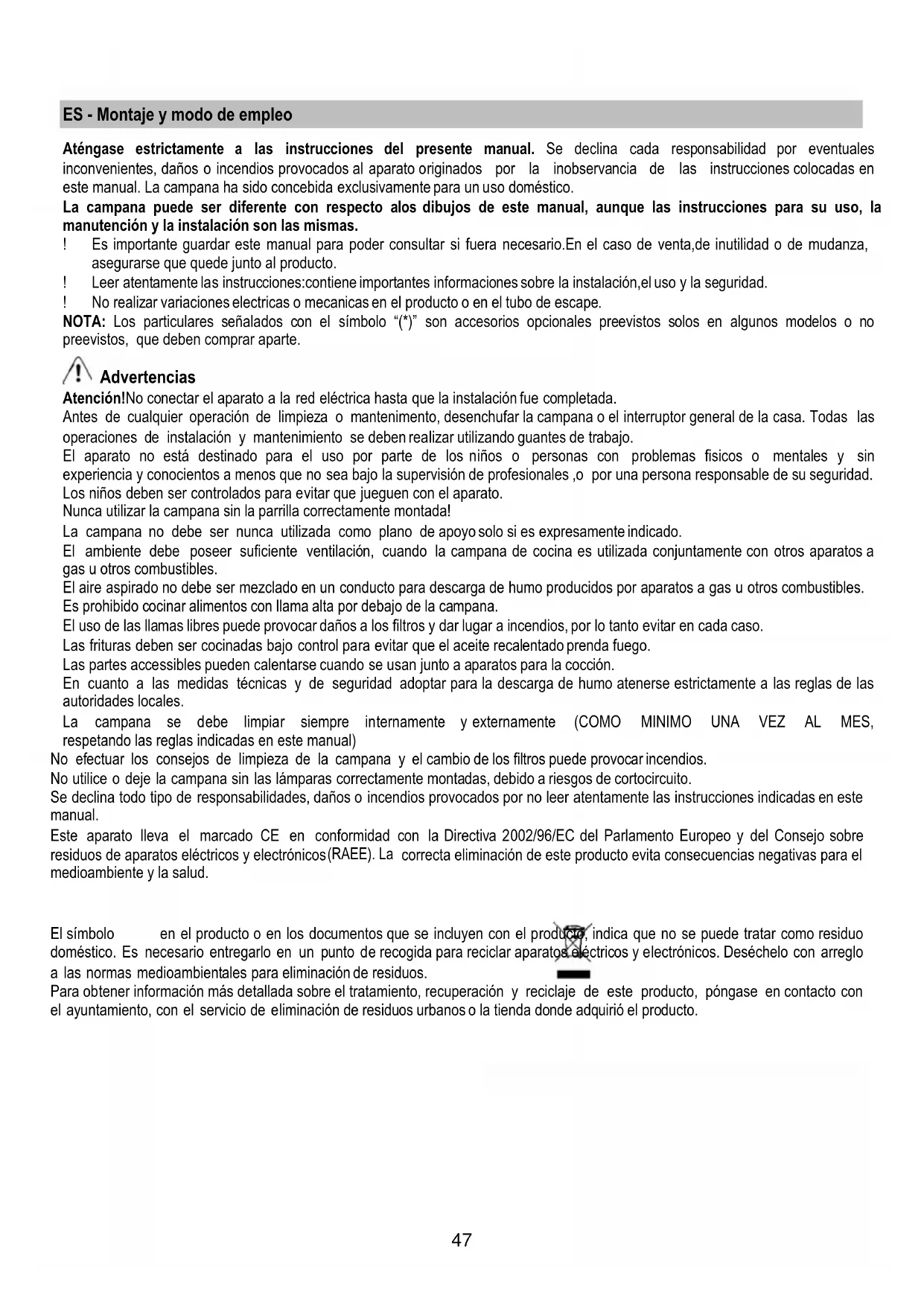 este manual. La campana ha sido concebida exclusivamente para un uso doméstico.