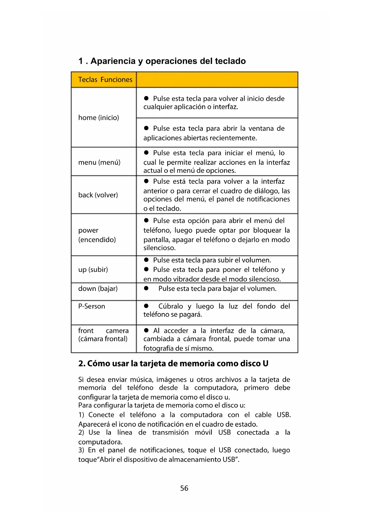 AVISOS PARA EL USO DEL TELÉFONO .....................................................9056 1 . Apariencia y operaciones del teclado Teclas Funciones home (inicio) z Pulse esta tecla para volver al inicio desde cualquier aplicación o interfaz. z Pulse esta tecla para abrir la ventana de aplicaciones abiertas recientemente. menu (menú) z Pulse esta tecla para iniciar el menú, lo cual le permite realizar acciones en la interfaz actual o el menú de opciones. back (volver) z Pulse está tecla para volver a la interfaz anterior o para cerrar el cuadro de diálogo, las opciones del menú, el panel de notificaciones o el teclado. power (encendido) z Pulse esta opción para abrir el menú del teléfono, luego puede optar por bloquear la pantalla, apagar el teléfono o dejarlo en modo silencioso. up (subir) z Pulse esta tecla para subir el volumen. z Pulse esta tecla para poner el teléfono y en modo vibrador desde el modo silencioso. down (bajar) z Pulse esta tecla para bajar el volumen. P-Serson z Cúbralo y luego la luz del fondo del teléfono se pagará. front camera (cámara frontal) z Al acceder a la interfaz de la cámara, cambiada a cámara frontal, puede tomar una fotografía de sí mismo.