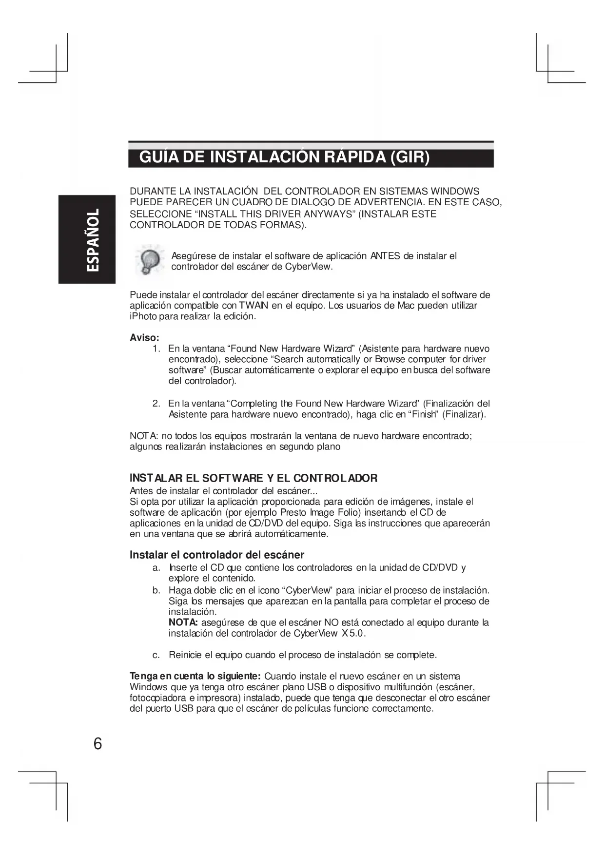 Asegúrese de instalar el software de aplicación ANTES de instalar el controlador del escáner de CyberView.