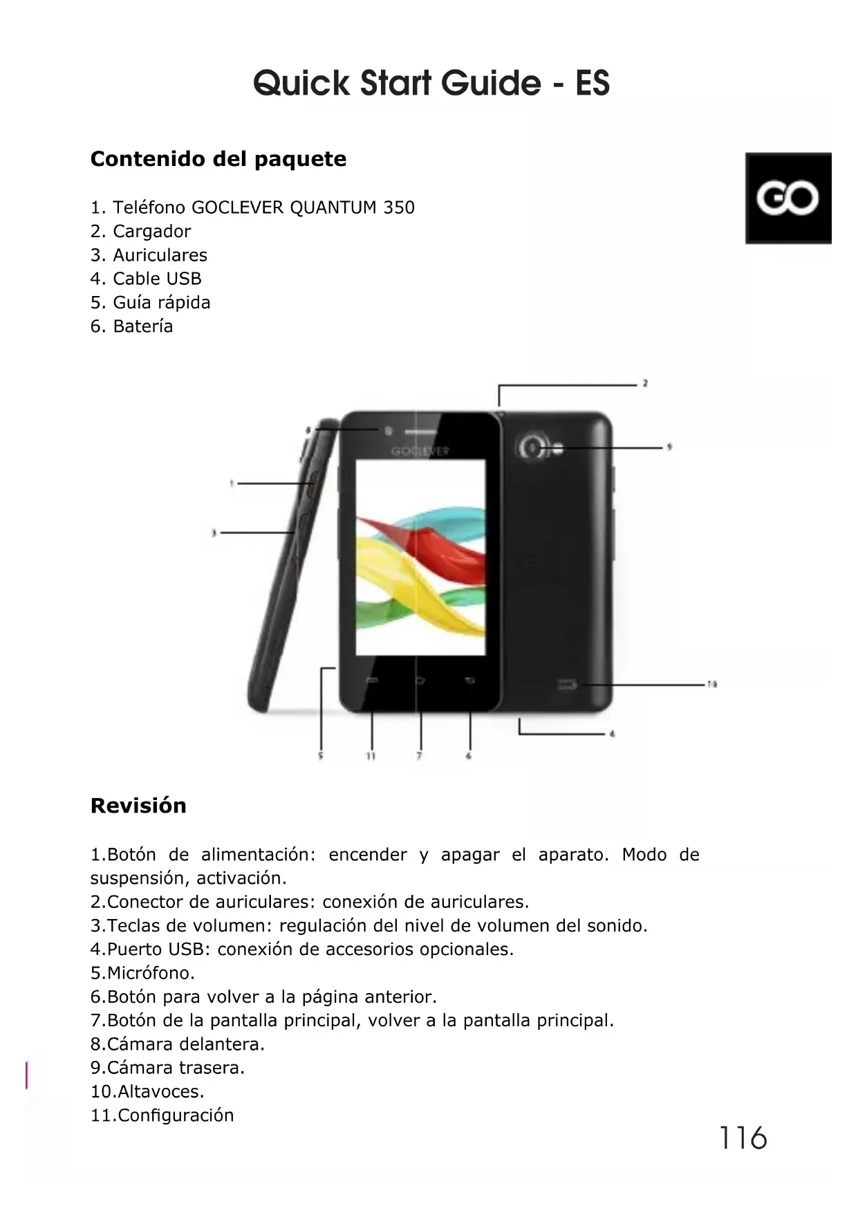 115Revisión 1.Botón de alimentación: encender y apagar el aparato. Modo de suspensión, activación. 2.Conector de auriculares: conexión de auriculares. 3.Teclas de volumen: regulación del nivel de volumen del sonido. 4.Puerto USB: conexión de accesorios opcionales. 5.Micrófono. 6.Botón para volver a la página anterior. 7.Botón de la pantalla principal, volver a la pantalla principal. 8.Cámara delantera. 9.Cámara trasera. 10.Altavoces. 11.Conguración Contenido del paquete