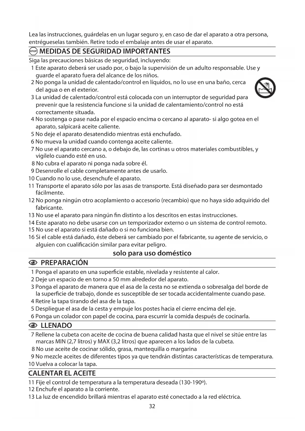 Siga las precauciones básicas de seguridad, incluyendo: 1 Este aparato deberá ser usado por, o bajo la supervisión de un adulto responsable. Use y guarde el aparato fuera del alcance de los niños. 2 No ponga la unidad de calentado/control en líquidos, no lo use en una baño, cerca del agua o en el exterior. 3 La unidad de calentado/control está colocada con un interruptor de seguridad para prevenir que la resistencia funcione si la unidad de calentamiento/control no está correctamente situada. 4 No sostenga o pase nada por el espacio encima o cercano al aparato- si algo gotea en el aparato, salpicará aceite caliente. 5 No deje el aparato desatendido mientras está enchufado. 6 No mueva la unidad cuando contenga aceite caliente. 7 No use el aparato cercano a, o debajo de, las cortinas u otros materiales combustibles, y vigílelo cuando esté en uso. 8 No cubra el aparato ni ponga nada sobre él. 9 Desenrolle el cable completamente antes de usarlo. 10 Cuando no lo use, desenchufe el aparato. 11 Transporte el aparato sólo por las asas de transporte. Está diseñado para ser desmontado fácilmente. 12 No ponga ningún otro acoplamiento o accesorio (recambio) que no haya sido adquirido del fabricante. 13 No use el aparato para ningún fin distinto a los descritos en estas instrucciones. 14 Este aparato no debe usarse con un temporizador externo o un sistema de control remoto. 15 No use el aparato si está dañado o si no funciona bien. 16 Si el cable está dañado, éste deberá ser cambiado por el fabricante, su agente de servicio, o alguien con cualificación similar para evitar peligro. solo para uso doméstico