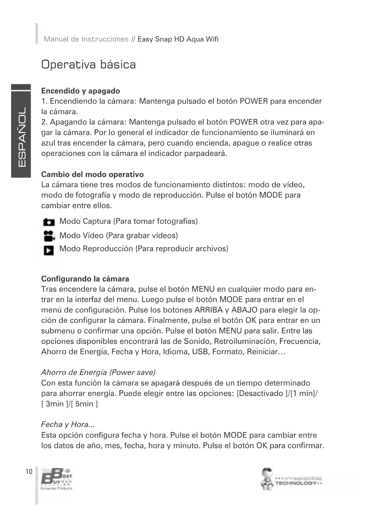 gar la cámara. Por lo general el indicador de funcionamiento se iluminará en azul tras encender la cámara, pero cuando encienda, apague o realice otras operaciones con la cámara el indicador parpadeará. Cambio del modo operativo La cámara tiene tres modos de funcionamiento distintos: modo de vídeo, modo de fotografía y modo de reproducción. Pulse el botón MODE para cambiar entre ellos. Configurando la cámara Tras encendere la cámara, pulse el botón MENU en cualquier modo para en- trar en la interfaz del menu. Luego pulse el botón MODE para entrar en el menú de configuración. Pulse los botones ARRIBA y ABAJO para elegir la op- ción de configurar la cámara. Finalmente, pulse el botón OK para entrar en un submenu o confirmar una opción. Pulse el botón MENU para salir. Entre las opciones disponibles encontrará las de Sonido, Retroiluminación, Frecuencia, Ahorro de Energía, Fecha y Hora, Idioma, USB, Formato, Reiniciar… Ahorro de Energía (Power save) Con esta función la cámara se apagará después de un tiempo determinado para ahorrar energía. Puede elegir entre las opciones: [Desactivado ]/[1 min]/ [ 3min ]/[ 5min ] Fecha y Hora... Esta opción configura fecha y hora. Pulse el botón MODE para cambiar entre los datos de año, mes, fecha, hora y minuto. Pulse el botón OK para confirmar. E S PA ÑO L Manual de Instrucciones // Easy Snap HD Aqua Wifi