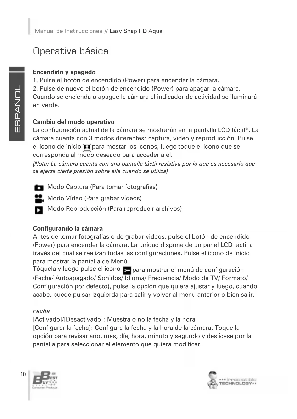 Cuando se encienda o apague la cámara el indicador de actividad se iluminará en verde. Cambio del modo operativo La configuración actual de la cámara se mostrarán en la pantalla LCD táctil*. La cámara cuenta con 3 modos diferentes: captura, video y reproducción. Pulse corresponda al modo deseado para acceder a él. (Nota: La cámara cuenta con una pantalla táctil resistiva por lo que es necesario que se ejerza cierta presión sobre ella cuando se utiliza) Configurando la cámara Antes de tomar fotografías o de grabar videos, pulse el botón de encendido (Power) para encender la cámara. La unidad dispone de un panel LCD táctil a través del cual se realizan todas las configuraciones. Pulse el icono de inicio para mostrar la pantalla de Menú. (Fecha/ Autoapagado/ Sonidos/ Idioma/ Frecuencia/ Modo de TV/ Formato/ Configuración por defecto), pulse la opción que quiera ajustar y luego, cuando acabe, puede pulsar Izquierda para salir y volver al menú anterior o bien salir. Fecha [Activado]/[Desactivado]: Muestra o no la fecha y la hora. [Configurar la fecha]: Configura la fecha y la hora de la cámara. Toque la opción para revisar año, mes, día, hora, minuto y segundo y deslícese por la pantalla para seleccionar el elemento que quiera modificar. E S PA ÑO L Manual de Instrucciones // Easy Snap HD Aqua