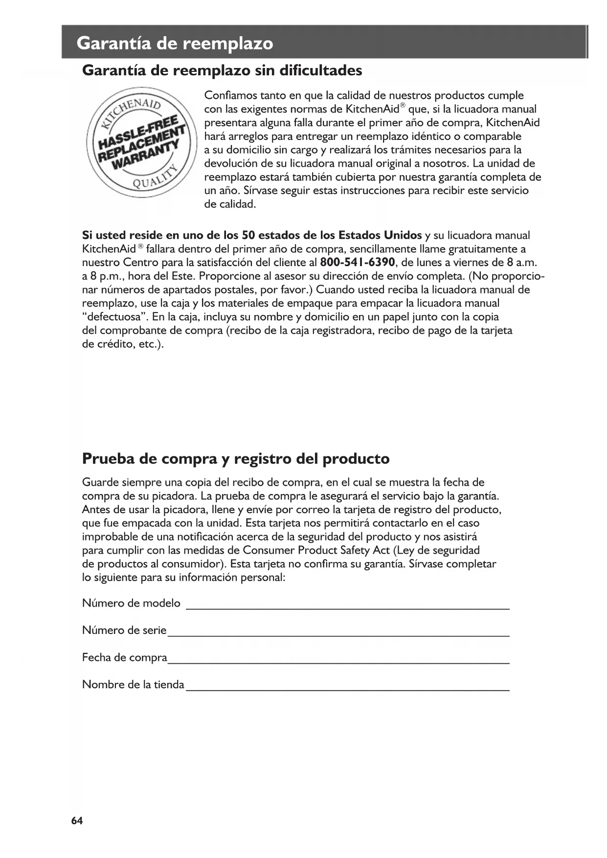 Garantía de reemplazo sin dicultades 64