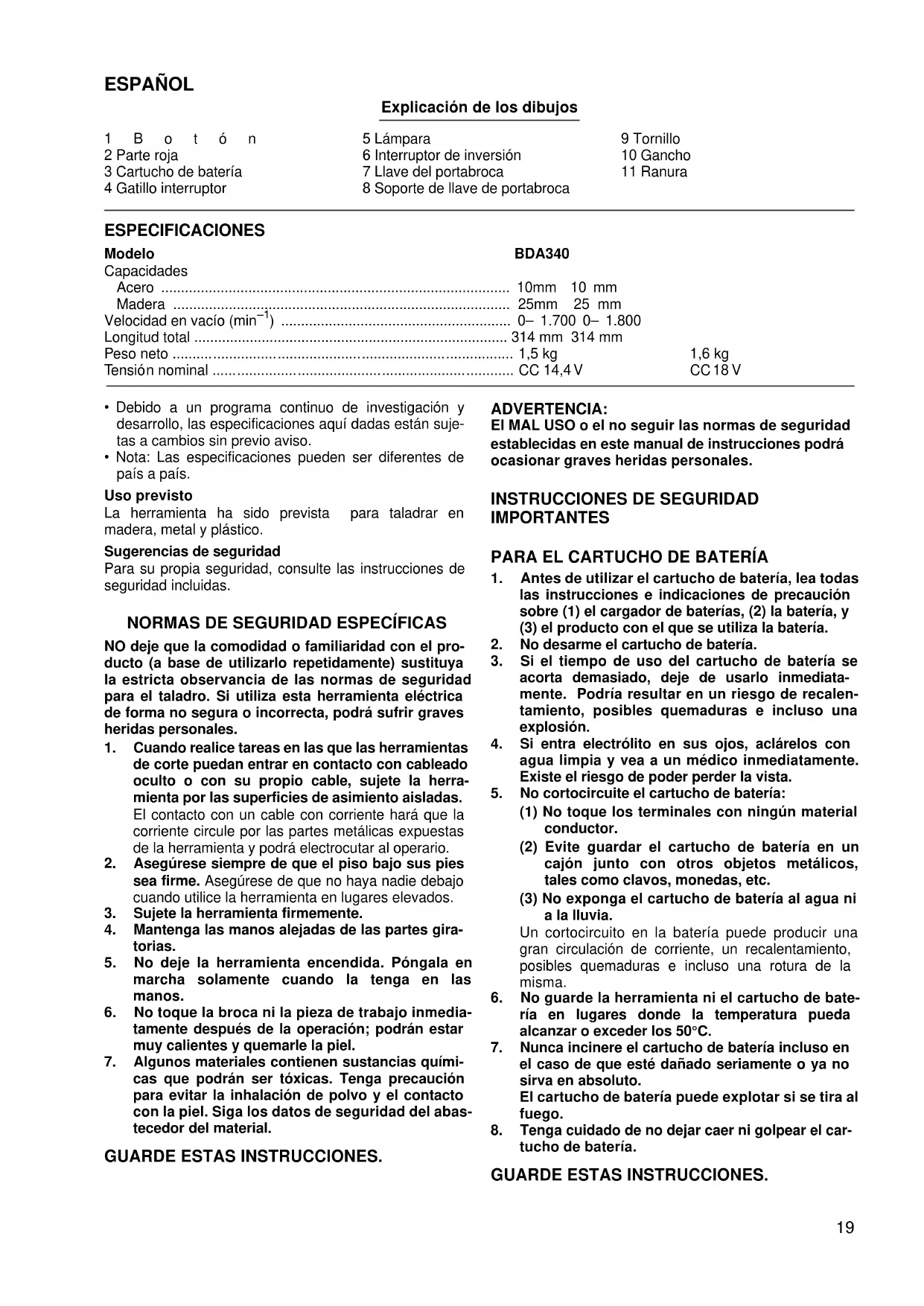 INSTRUCCIONES DE SEGURIDAD IMPORTANTES PARA EL CARTUCHO DE BATERÍA