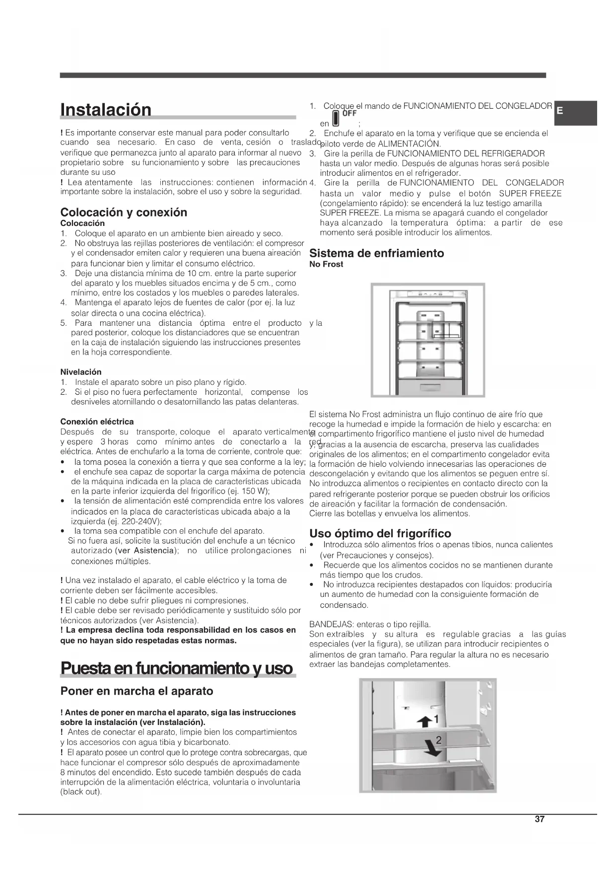 Este equipamiento es conforme con las siguientes DirectivasComunitarias:-73/23/CEEdel19/02/73(BajaTensión)ysucesivasmodificaciones;-89/336/CEEdel03/05/89(CompatibilidadElectromagnética)ysucesivasmodificaciones;-2002/96/CE. Seguridad general • Elaparatohasidopensadoparaunusodetiponoprofesionalenelinteriordeunavivienda.• Elaparato debe ser utilizado para conservar y congelaralimentossóloporpersonasadultasysegúnlasindicacionescontenidasenestemanual.• Elaparatonosedebeinstalaralairelibrenisiquierasiellugarestáprotegidodebidoaqueesmuypeligrosodejarloexpuestoalalluviaytormentas.• Notoqueelaparatoestandodescalzooconlasmanosopiesmojadosohúmedos.• Notoquelaspiezasrefrigerantesinternas:podríaquemarseoherirse.• Nodesenchufeelaparatotirandodelcablesinosujetandoelenchufe.• Es necesario desenchufar el aparato antes derealizaroperacionesdelimpiezaydemantenimiento.NoessuficientellevarelmandoparaLAREGULACIÓNDELATEMPERATURAhastalaposiciónOFF(aparatoapagado)paraeliminartodocontactoeléctrico.• Encasodeavería,nuncaaccedaalosmecanismosinternosparaintentarunareparación.• Enelinteriorde los compartimientos donde se conservanalimentos congelados, no utilice utensilios cortantes o conpuntaniaparatoseléctricos,quenoseanlosrecomendadosporelfabricante.• Nointroduzcaensuboca cubitos apenas extraídos delcongelador.• Esteaparatonopuedeserutilizadoporpersonas(incluidoslosniños)con capacidades físicas,sensorialeso mentalesdisminuidasosinexperiencia,salvoqueesténsupervisadasoinstruidassobreelusodelaparatoporunapersonaresponsable de su seguridad. Los niños deberían sercontroladosparagarantizarquenojueguenconelaparato.• Losembalajesnosonjuguetesparalosniños. Eliminación • Eliminación del material deembalaje: respete las normaslocales,deestamaneralosembalajespodránserreutilizados.• EnbasealaNorma europea 2002/96/CE de Residuos deaparatosEléctricosyElectrónicos(RAEE),loselectrodomésticosviejosnopuedenserarrojadosenloscontenedoresmunicipaleshabituales; tienen que ser recogidos selectivamente paraoptimizar la recuperación y reciclado de los componentes ymaterialesquelosconstituyen,yreducirelimpactoenlasaludhumanayelmedioambiente.El símbolo del cubo de basuratachadosemarcasobretodoslosproductospararecordaralconsumidor la obligación de separarlos para la recogidaselectiva.Elconsumidordebecontactarconlaautoridadlocaloconelvendedorparainformarseenrelaciónala correctaeleminacióndesuelectrodomésticoviejo. Ahorrar y respetar el medio ambiente • Instale el aparato enunaambientefrescoybien aireado,protéjalodelaexposicióndirectaalosrayossolaresynolocoloquecercadefuentesdecalor.• Paraintroduciroextraerlosalimentos,abralaspuertasdelaparatoelmenortiempoposible.Cadaaperturadelaspuertasproduceunnotablegastodeenergía.• Nollenecondemasiadosalimentoselaparato:paraunabuenaconservación,elfríodebepodercircularlibremente.Siseimpidelacirculación,elcompresortrabajarácontinuamente.• Nointroduzca alimentoscalientes: elevaríanlatemperaturainteriorobligandoal compresor aunmayortrabajo con ungrangastodeenergíaeléctrica.• Descongeleelaparatosiseformarahielo(ver Mantenimiento);unaespesacapadehielovuelvemásdifícillacesióndefríoalosalimentosyhacequeaumenteelconsumodeenergía. *Lacantidady/osuubicaciónpuedenvariar,seencuentrasolo enalgunosmodelos.40