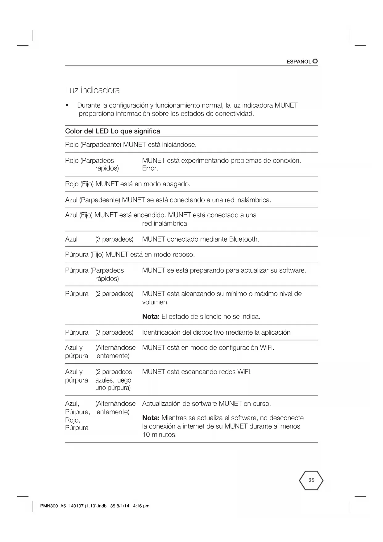 - Durante la configuración y funcionamiento normal, la luz indicadora MUNET proporciona información sobre los estados de conectividad. Color del LED Lo que significa Rojo (Parpadeante) MUNET está iniciándose. Rojo (Parpadeos rápidos) MUNET está experimentando problemas de conexión. Error. Rojo (Fijo) MUNET está en modo apagado. Azul (Parpadeante) MUNET se está conectando a una red inalámbrica. Azul (Fijo) MUNET está encendido. MUNET está conectado a una red inalámbrica. Azul (3 parpadeos) MUNET conectado mediante Bluetooth. Púrpura (Fijo) MUNET está en modo reposo. Púrpura (Parpadeos rápidos) MUNET se está preparando para actualizar su software. Púrpura (2 parpadeos) MUNET está alcanzando su mínimo o máximo nivel de volumen. Nota: El estado de silencio no se indica. Púrpura (3 parpadeos) Identificación del dispositivo mediante la aplicación Azul y púrpura (Alternándose lentamente) MUNET está en modo de configuración WIFi. Azul y púrpura (2 parpadeos azules, luego uno púrpura) MUNET está escaneando redes WiFI. Azul, Púrpura, Rojo, Púrpura (Alternándose lentamente) Actualización de software MUNET en curso. Nota: Mientras se actualiza el software, no desconecte la conexión a internet de su MUNET durante al menos 10 minutos. PMN300_A5_140107 (1.10).indb 35 8/1/14 4:16 pmESPAÑOL