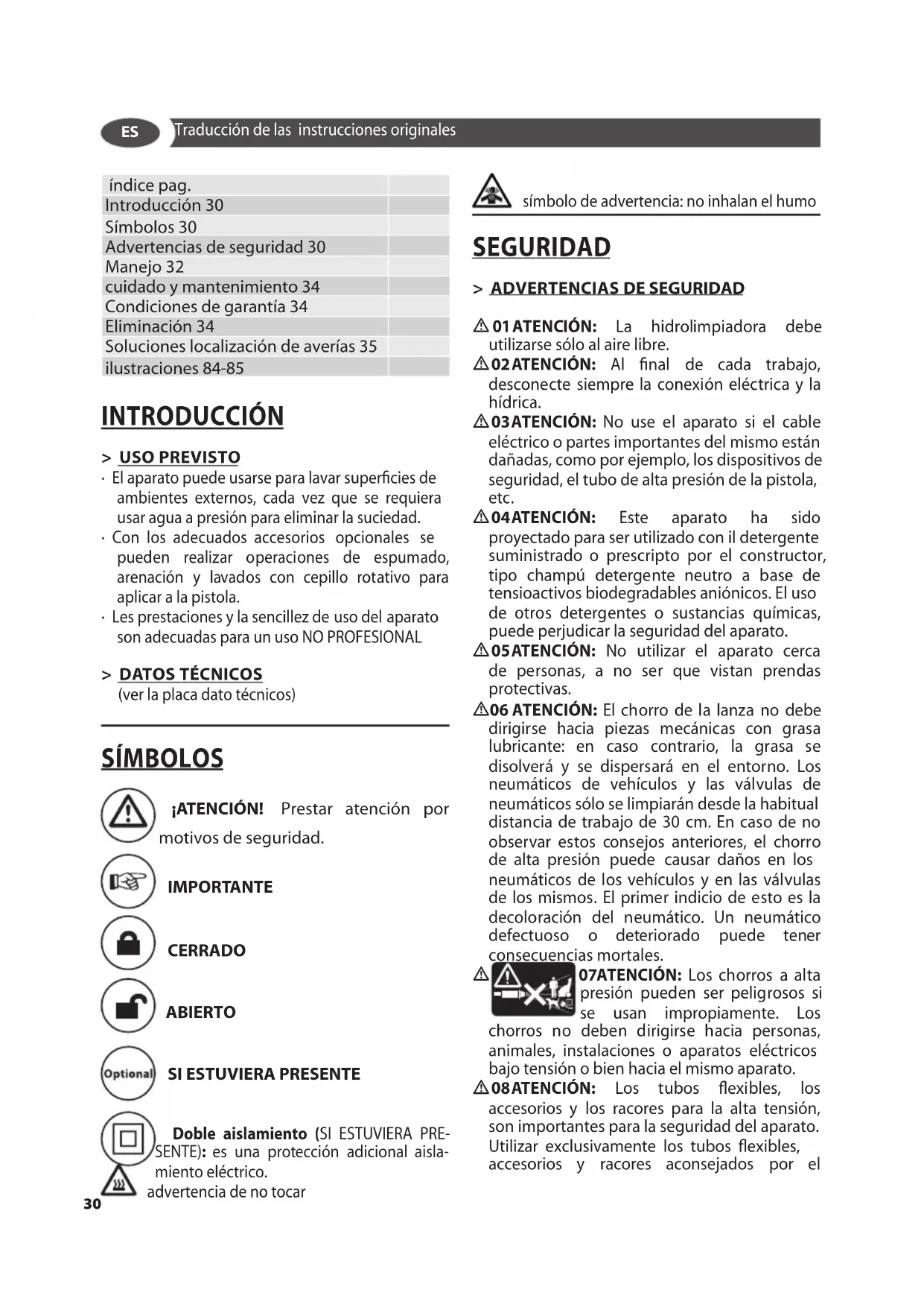 índice pag. Introducción 30 Símbolos 30 Advertencias de seguridad 30 Manejo 32 cuidado y mantenimiento 34 Condiciones de garantía 34 Eliminación 34 Soluciones localización de averías 35 ilustraciones 84-85 INTRODUCCIÓN > USO PREVISTO