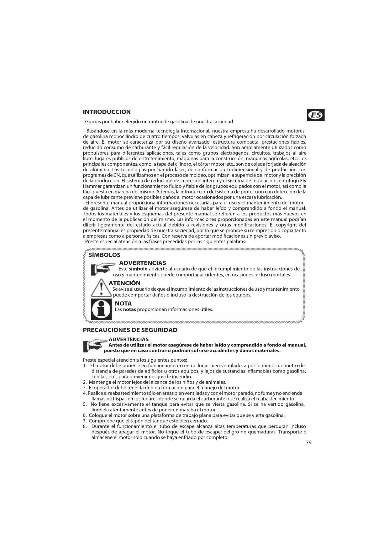 B1 Schwarz Y Gelb G Grün DE79 INTRODUCCIÓN Gracias por haber elegido un motor de gasolina de nuestra sociedad. Basándose en la más moderna tecnología internacional, nuestra empresa ha desarrollado motores de gasolina monocilindro de cuatro tiempos, válvulas en cabeza y refrigeración por circulación forzada de aire. El motor se caracteriza por su diseño avanzado, estructura compacta, prestaciones fiables, reducido consumo de carburante y fácil regulación de la velocidad. Son ampliamente utilizados como propulsores para diferentes aplicaciones, tales como grupos electrógenos, circuitos, trabajos al aire libre, lugares públicos de entretenimiento, máquinas para la construcción, máquinas agrícolas, etc. Los principales componentes, como la tapa del cilindro, el cárter motor, etc., son de colada forjada de aleación de aluminio. Las tecnologías por barrido láser, de conformación tridimensional y de producción con programas de CN, que utilizamos en el proceso de moldeo, optimizan la superficie del motor y la precisión de la producción. El sistema de reducción de la presión interna y el sistema de regulación centrífugo Fly Hammer garantizan un funcionamiento fluido y fiable de los grupos equipados con el motor, así como la fácil puesta en marcha del mismo. Además, la introducción del sistema de protección con detección de la capa de lubricante previene posibles daños al motor ocasionados por una escasa lubricación. El presente manual proporciona informaciones necesarias para el uso y el mantenimiento del motor de gasolina. Antes de utilizar el motor asegúrese de haber leído y comprendido a fondo el manual. Todos los materiales y los esquemas del presente manual se refieren a los productos más nuevos en el momento de la publicación del mismo. Las informaciones proporcionadas en este manual podrían diferir ligeramente del estado actual debido a revisiones y otras modificaciones. El copyright del presente manual es propiedad de nuestra sociedad, por lo que se prohibe su reimpresión o copia tanto a empresas como a personas físicas. Con reserva de aportar modificaciones sin previo aviso. Preste especial atención a las frases precedidas por las siguientes palabras: