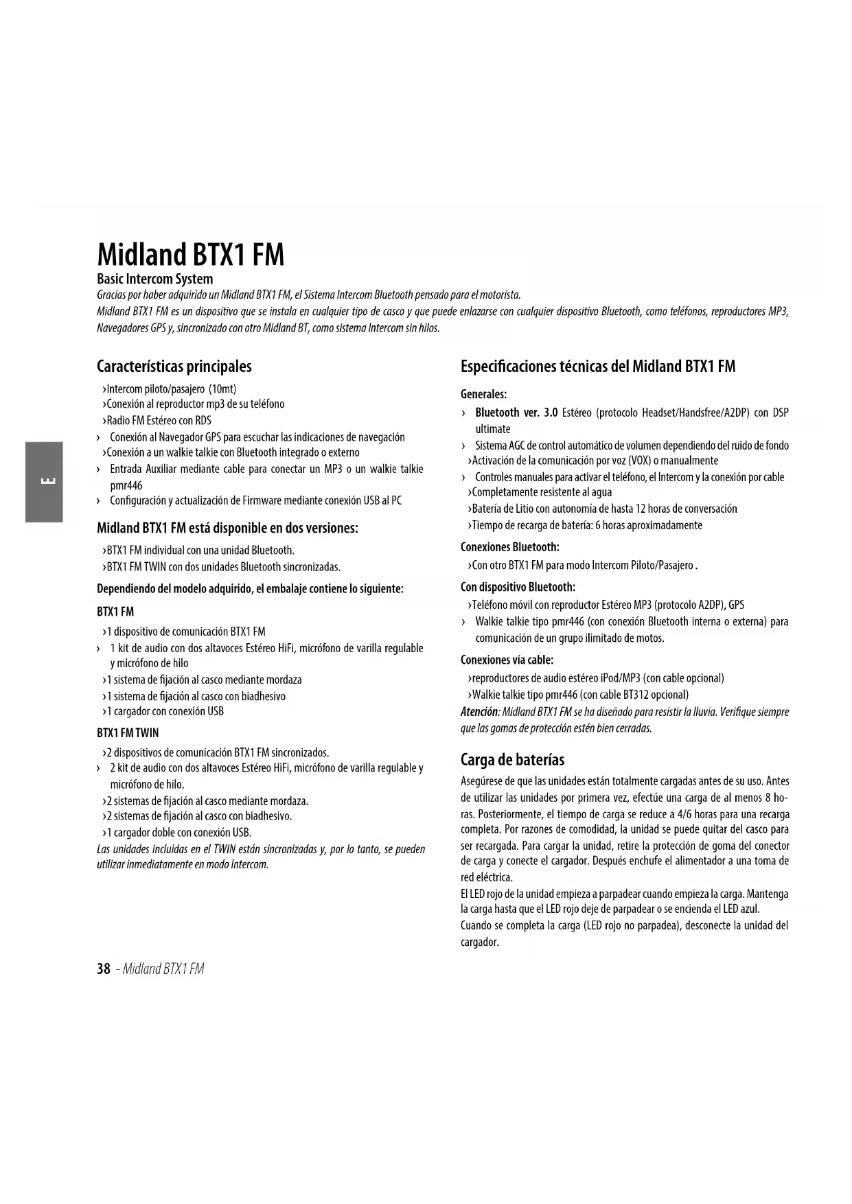 › Conguración y actualización de Firmware mediante conexión USB al PC Midland BTX1 FM está disponible en dos versiones: › BTX1 FM individual con una unidad Bluetooth. › BTX1 FM TWIN con dos unidades Bluetooth sincronizadas. Dependiendo del modelo adquirido, el embalaje contiene lo siguiente:BTX1 FM › 1 dispositivo de comunicación BTX1 FM › 1 kit de audio con dos altavoces Estéreo HiFi, micrófono de varilla regulable y micrófono de hilo › 1 sistema de jación al casco mediante mordaza › 1 sistema de jación al casco con biadhesivo › 1 cargador con conexión USBBTX1 FM TWIN › 2 dispositivos de comunicación BTX1 FM sincronizados. › 2 kit de audio con dos altavoces Estéreo HiFi, micrófono de varilla regulable y micrófono de hilo. › 2 sistemas de jación al casco mediante mordaza. › 2 sistemas de jación al casco con biadhesivo. › 1 cargador doble con conexión USB.Las unidades incluidas en el TWIN están sincronizadas y, por lo tanto, se pueden utilizar inmediatamente en modo Intercom. Especificaciones técnicas del Midland BTX1 FM Generales: › Bluetooth ver. 3.0 Estéreo (protocolo Headset/Handsfree/A2DP) con DSP ultimate › Sistema AGC de control automático de volumen dependiendo del ruido de fondo › Activación de la comunicación por voz (VOX) o manualmente › Controles manuales para activar el teléfono, el Intercom y la conexión por cable › Completamente resistente al agua › Batería de Litio con autonomía de hasta 12 horas de conversación › Tiempo de recarga de batería: 6 horas aproximadamenteConexiones Bluetooth: › Con otro BTX1 FM para modo Intercom Piloto/Pasajero .Con dispositivo Bluetooth: › Teléfono móvil con reproductor Estéreo MP3 (protocolo A2DP), GPS › Walkie talkie tipo pmr446 (con conexión Bluetooth interna o externa) para comunicación de un grupo ilimitado de motos.Conexiones vía cable: › reproductores de audio estéreo iPod/MP3 (con cable opcional) › Walkie talkie tipo pmr446 (con cable BT312 opcional)Atención: Midland BTX1 FM se ha diseñado para resistir la lluvia. Verique siempre que las gomas de protección estén bien cerradas. Carga de baterías