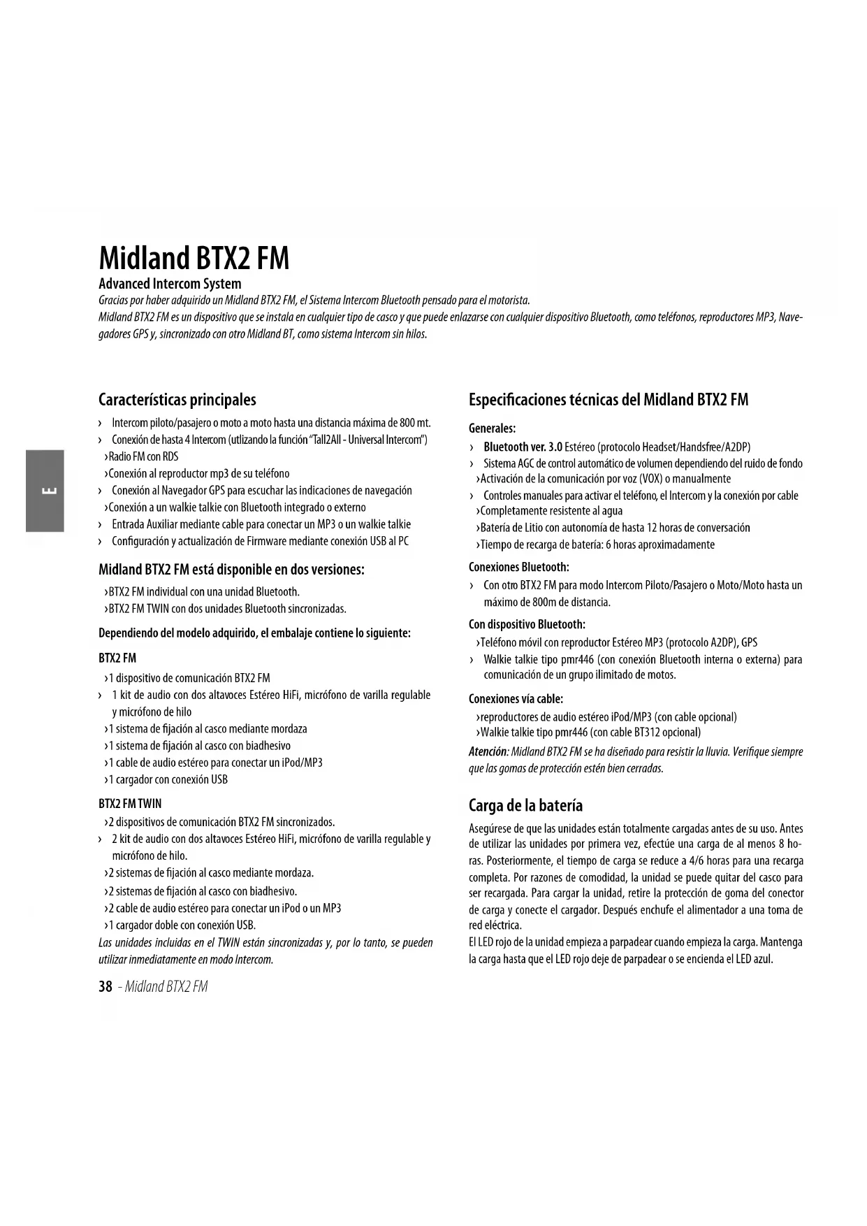 Midland BTX2 FM Advanced Intercom System Gracias por haber adquirido un Midland BTX2 FM, el Sistema Intercom Bluetooth pensado para el motorista. Midland BTX2 FM es un dispositivo que se instala en cualquier tipo de casco y que puede enlazarse con cualquier dispositivo Bluetooth, como teléfonos, reproductores MP3, Nave- gadores GPS y, sincronizado con otro Midland BT, como sistema Intercom sin hilos. Características principales › Intercom piloto/pasajero o moto a moto hasta una distancia máxima de 800 mt. › Conexión de hasta 4 Intercom (utlizando la función “Tall2All - Universal Intercom”) › Radio FM con RDS › Conexión al reproductor mp3 de su teléfono › Conexión al Navegador GPS para escuchar las indicaciones de navegación › Conexión a un walkie talkie con Bluetooth integrado o externo › Entrada Auxiliar mediante cable para conectar un MP3 o un walkie talkie › Configuración y actualización de Firmware mediante conexión USB al PC Midland BTX2 FM está disponible en dos versiones: › BTX2 FM individual con una unidad Bluetooth. › BTX2 FM TWIN con dos unidades Bluetooth sincronizadas. Dependiendo del modelo adquirido, el embalaje contiene lo siguiente:BTX2 FM › 1 dispositivo de comunicación BTX2 FM › 1 kit de audio con dos altavoces Estéreo HiFi, micrófono de varilla regulable y micrófono de hilo › 1 sistema de fijación al casco mediante mordaza › 1 sistema de fijación al casco con biadhesivo › 1 cable de audio estéreo para conectar un iPod/MP3 › 1 cargador con conexión USBBTX2 FM TWIN › 2 dispositivos de comunicación BTX2 FM sincronizados. › 2 kit de audio con dos altavoces Estéreo HiFi, micrófono de varilla regulable y micrófono de hilo. › 2 sistemas de fijación al casco mediante mordaza. › 2 sistemas de fijación al casco con biadhesivo. › 2 cable de audio estéreo para conectar un iPod o un MP3 › 1 cargador doble con conexión USB.Las unidades incluidas en el TWIN están sincronizadas y, por lo tanto, se pueden utilizar inmediatamente en modo Intercom. Especificaciones técnicas del Midland BTX2 FM Generales: › Bluetooth ver. 3.0 Estéreo (protocolo Headset/Handsfree/A2DP) › Sistema AGC de control automático de volumen dependiendo del ruido de fondo › Activación de la comunicación por voz (VOX) o manualmente › Controles manuales para activar el teléfono, el Intercom y la conexión por cable › Completamente resistente al agua › Batería de Litio con autonomía de hasta 12 horas de conversación › Tiempo de recarga de batería: 6 horas aproximadamenteConexiones Bluetooth: › Con otro BTX2 FM para modo Intercom Piloto/Pasajero o Moto/Moto hasta un máximo de 800m de distancia.Con dispositivo Bluetooth: › Teléfono móvil con reproductor Estéreo MP3 (protocolo A2DP), GPS › Walkie talkie tipo pmr446 (con conexión Bluetooth interna o externa) para comunicación de un grupo ilimitado de motos.Conexiones vía cable: › reproductores de audio estéreo iPod/MP3 (con cable opcional) › Walkie talkie tipo pmr446 (con cable BT312 opcional)Atención: Midland BTX2 FM se ha diseñado para resistir la lluvia. Verifique siempre que las gomas de protección estén bien cerradas. Carga de la batería Asegúrese de que las unidades están totalmente cargadas antes de su uso. Antes de utilizar las unidades por primera vez, efectúe una carga de al menos 8 ho-ras. Posteriormente, el tiempo de carga se reduce a 4/6 horas para una recarga completa. Por razones de comodidad, la unidad se puede quitar del casco para ser recargada. Para cargar la unidad, retire la protección de goma del conector de carga y conecte el cargador. Después enchufe el alimentador a una toma de red eléctrica. El LED rojo de la unidad empieza a parpadear cuando empieza la carga. Mantenga la carga hasta que el LED rojo deje de parpadear o se encienda el LED azul.E Midland BTX2 FM - 39 Cuando se completa la carga (LED rojo no parpadea), desconecte la unidad del cargador. Atención: cada vez que se conecta o desconecta el USB de carga, la unidad se apaga automáticamente. Si quiere utilizarla mientras se carga, debe encenderla después de que haya conectado el cargador. Descripción del dispositivo y del sistema de montaje Descripción BTX2 FM BTX2 FM dispone de cinco teclas en el frontal: las tres grandes son multifunción: Adelante (izquierda en el dibujo), Central y Atrás (derecha) y las dos pequeñas teclas redondeadas para el control de volumen. Descripción de las conexiones por cable › Toma de carga: para la carga del dispositivo mediante el cargador con toma mini USB › Toma Kit de Audio: para la conexión del kit de audio (auriculares estéreo y micrófono) › Toma de audio auxiliar (AUX) 2,5mm: permite la conexión de un iPod/MP3 estéreo o un transceptor pmr446. Además, BTX2 FM incorpora una antena desplegable en la parte superior, para conseguir un alcance máximo. Para levantar la antena basta con efectuar una ligera presión hacia el exterior, ésta se desenganchará y se levantará automáti- camente. Para cerrar la antena basta con bajarla y efectuar una ligera presión hacia el inte- rior de manera que se encastre en la hendidura. Descripción del kit de audio El sistema de audio incluye dos altavoces estéreo ultra planos y dos micrófonos in- tercambiables, uno de varilla regulable y el otro de hilo. El miniconector del micrófono permite intercambiarlos con suma facilidad. Altavoces estéreo Los altavoces disponen de un velcro adhesivo que le ayudará a montarlos en el interior del casco, entre el acolchado y la calota. Atención, tenga en cuenta no cubrir totalmente su oreja con los altavoces, ya que debe escuchar siempre el sonido ambiente y las indicaciones del tráfico. El micrófono se puede fijar en el casco de dos formas: Micrófono de varilla regulable: Coloque la parte con el adhesivo entre la parte rígida del casco y el acolchado, de manera que el micrófono esté correctamente colocado en frente de su 