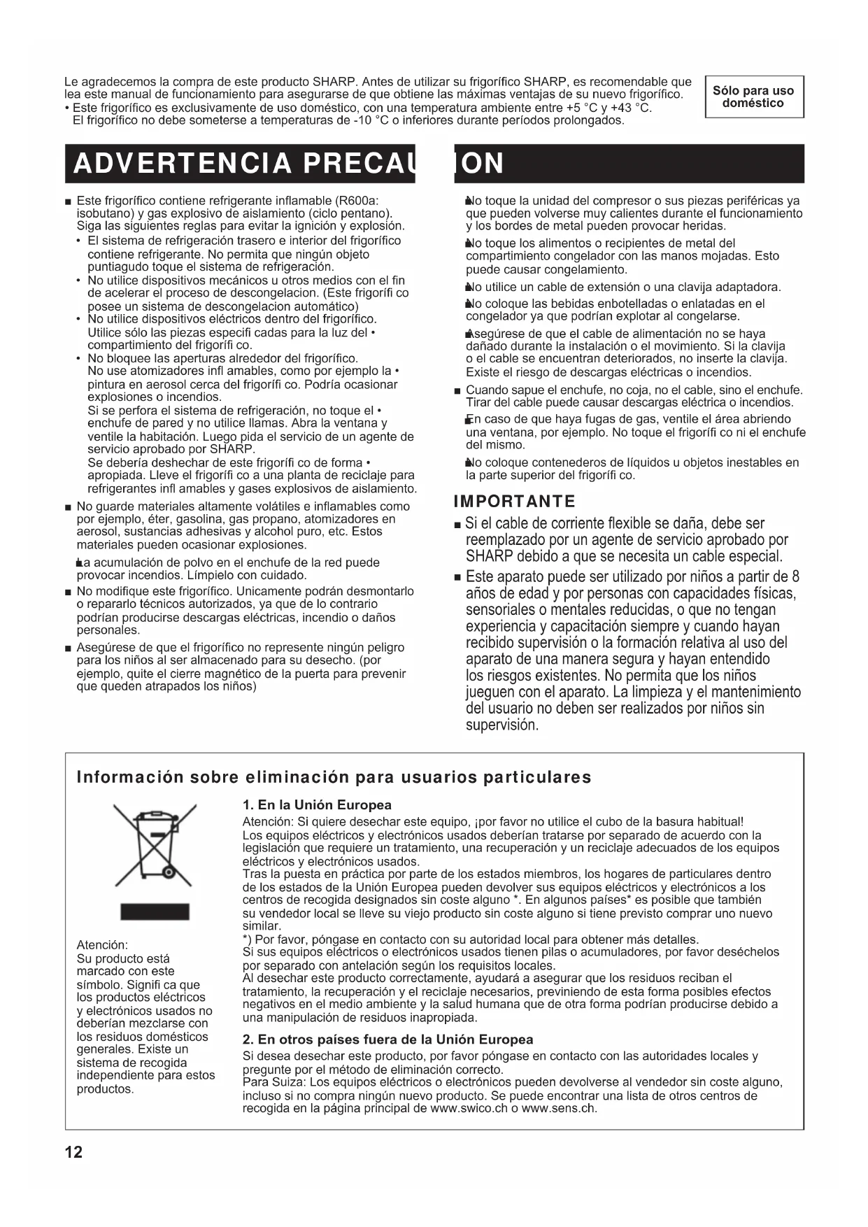 ADVERTENCIA PRECAUCION Este frigorífi co contiene refrigerante infl amable (R600a: ■