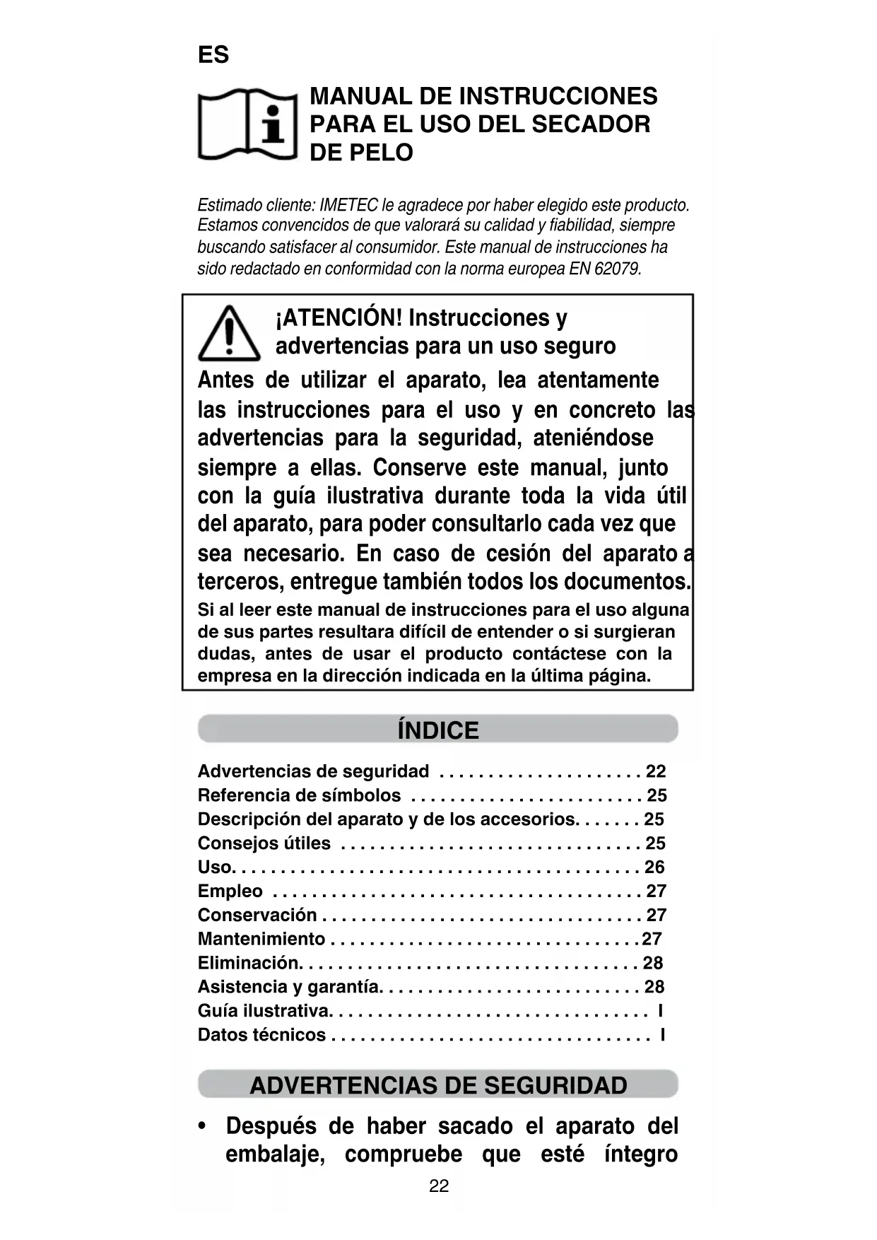 21MANUAL DE INSTRUCCIONES PARA EL USO DEL SECADOR DE PELO Estimado cliente: IMETEC le agradece por haber elegido este producto.