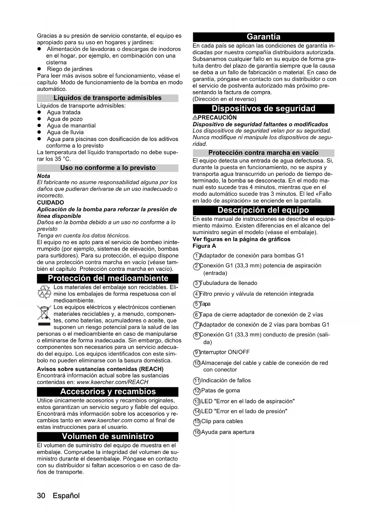 - Declaración de conformidad UE Chairman of the Board of Management Director Regulatory Affairs & Certification30 Español Gracias a su presión de servicio constante, el equipo es apropiado para su uso en hogares y jardines: Alimentación de lavadoras o descargas de inodoros en el hogar, por ejemplo, en combinación con una cisterna Riego de jardines Para leer más avisos sobre el funcionamiento, véase el capítulo Modo de funcionamiento de la bomba en modo automático. Líquidos de transporte admisibles Líquidos de transporte admisibles: Agua tratada Agua de pozo Agua de manantial Agua de lluvia Agua para piscinas con dosificación de los aditivos conforme a lo previsto La temperatura del líquido transportado no debe supe- rar los 35 °C. Uso no conforme a lo previsto Nota El fabricante no asume responsabilidad alguna por los daños que pudieran derivarse de un uso inadecuado o incorrecto. CUIDADO Aplicación de la bomba para reforzar la presión de línea disponible Daños en la bomba debido a un uso no conforme a lo previsto Tenga en cuenta los datos técnicos. El equipo no es apto para el servicio de bombeo ininte- rrumpido (por ejemplo, sistemas de elevación, bombas para surtidores). Para su protección, el equipo dispone de una protección contra marcha en vacío (véase tam- bién el capítulo Protección contra marcha en vacío). Protección del medioambiente Los materiales del embalaje son reciclables. Eli- mine los embalajes de forma respetuosa con el medioambiente. Los equipos eléctricos y electrónicos contienen materiales reciclables y, a menudo, componen- tes, como baterías, acumuladores o aceite, que suponen un riesgo potencial para la salud de las personas o el medioambiente en caso de manipularse o eliminarse de forma inadecuada. Sin embargo, dichos componentes son necesarios para un servicio adecua- do del equipo. Los equipos identificados con este sím- bolo no pueden eliminarse con la basura doméstica. Avisos sobre sustancias contenidas (REACH) Encontrará información actual sobre las sustancias contenidas en: www.kaercher.com/REACH Accesorios y recambios Utilice únicamente accesorios y recambios originales, estos garantizan un servicio seguro y fiable del equipo. Encontrará más información sobre los accesorios y re- cambios tanto en www.kaercher.com como al final de estas instrucciones para el usuario. Volumen de suministro El volumen de suministro del equipo de muestra en el embalaje. Compruebe la integridad del volumen de su- ministro durante el desembalaje. Póngase en contacto con su distribuidor si faltan accesorios o en caso de da- ños de transporte. Garantía En cada país se aplican las condiciones de garantía in- dicadas por nuestra compañía distribuidora autorizada. Subsanamos cualquier fallo en su equipo de forma gra- tuita dentro del plazo de garantía siempre que la causa se deba a un fallo de fabricación o material. En caso de garantía, póngase en contacto con su distribuidor o con el servicio de postventa autorizado más próximo pre- sentando la factura de compra. (Dirección en el reverso) Dispositivos de seguridad 몇 PRECAUCIÓN Dispositivo de seguridad faltantes o modificados Los dispositivos de seguridad velan por su seguridad. Nunca modifique ni manipule los dispositivos de segu- ridad. Protección contra marcha en vacío El equipo detecta una entrada de agua defectuosa. Si, durante la puesta en funcionamiento, no se aspira y transporta agua transcurrido un periodo de tiempo de- terminado, la bomba se desconecta. En el modo ma- nual esto sucede tras 4 minutos, mientras que en el modo automático sucede tras 3 minutos. El led «Fallo en lado de aspiración» se enciende en la pantalla. Descripción del equipo En este manual de instrucciones se describe el equipa- miento máximo. Existen diferencias en el alcance del suministro según el modelo (véase el embalaje). Ver figuras en la página de gráficos Figura A 1 Adaptador de conexión para bombas G1 2 Conexión G1 (33,3 mm) potencia de aspiración (entrada) 3 Tubuladura de llenado 4 Filtro previo y válvula de retención integrada 5 Tapa 6 Tapa de cierre adaptador de conexión de 2 vías 7 Adaptador de conexión de 2 vías para bombas G1 8 Conexión G1 (33,3 mm) conducto de presión (sali- da) 9 Interruptor ON/OFF 10 Almacenaje del cable y cable de conexión de red con conector 11 Indicación de fallos 12 Patas de goma 13 LED "Error en el lado de aspiración" 14 LED "Error en el lado de presión" 15 Clip para cables 16 Ayuda para aperturaEspañol 31 Puesta en funcionamiento Recomendamos utilizar exclusivamente mangueras de aspiración, componentes de filtrado y conexiones de mangueras originales de Kärcher. El uso de componen- tes de construcción de otros fabricantes pueden derivar en funcionamientos incorrectos durante la aspiración del líquido de transporte, especialmente si se usan sis- temas de conexión de bayoneta. Uso móvil Nota Incluso las fugas más insignificantes causan funciona- mientos incorrectos. Conexión de la manguera de aspiración Nota Recomendamos usar una manguera de aspiración con bloqueo del flujo de retorno. El bloqueo del flujo de re- torno reduce el tiempo de reaspiración debido a que im- pide el vaciado de la manguera de aspiración tras la toma de agua. No monte el bloqueo del flujo de retorno directamente en la bomba. Nota En caso de que deba transportarse agua con arena, re- comendamos usar un filtro previo adicional. Monte el fil- tro previo entre la manguera de aspiración y la bomba. Para más información sobre el bloqueo del flujo de re- torno y el filtro previo, véase el capítulo Accesorios y re- cambios. p. 34