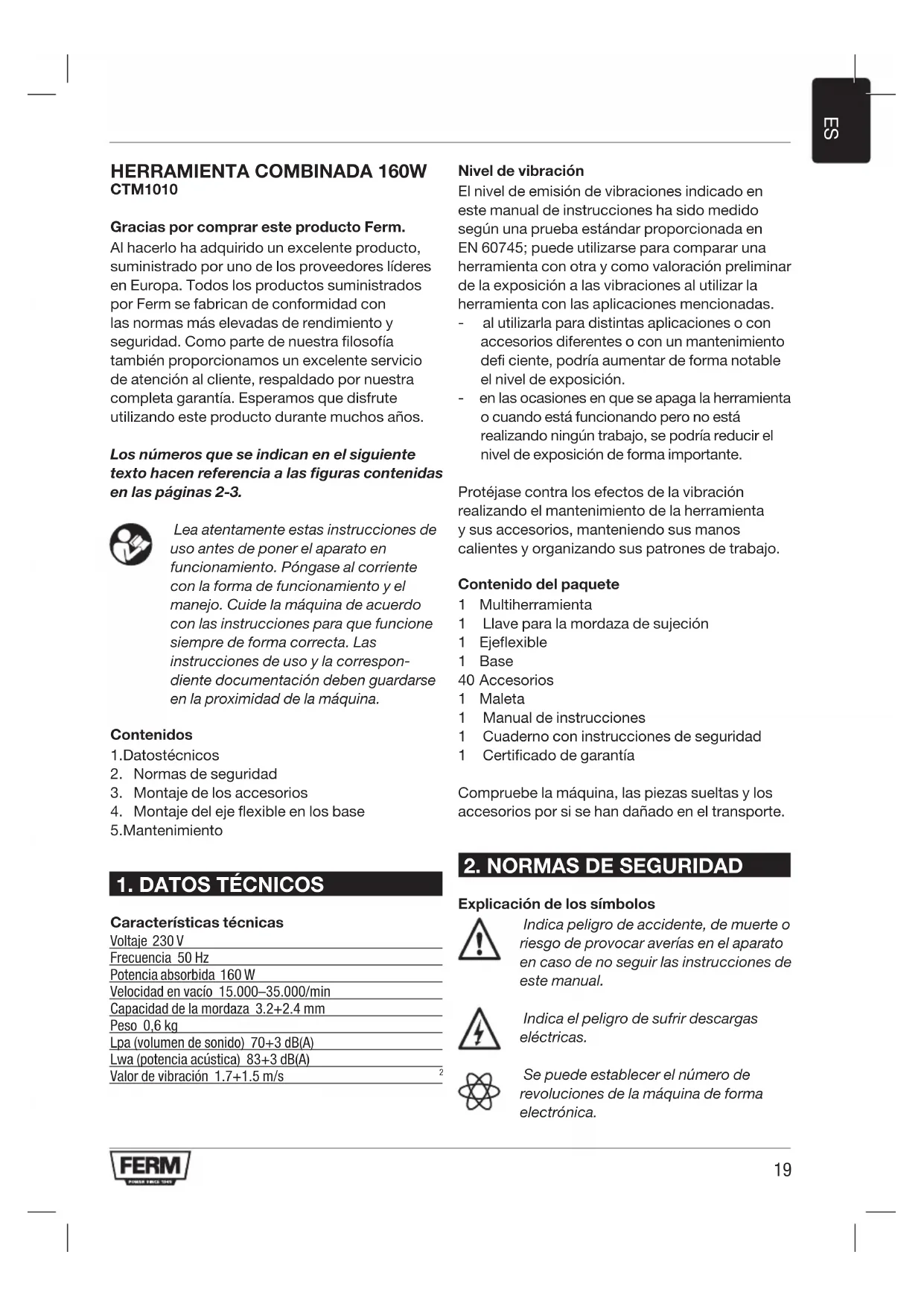 CTM1010 Gracias por comprar este producto Ferm. Al hacerlo ha adquirido un excelente producto, suministrado por uno de los proveedores líderes en Europa. Todos los productos suministrados por Ferm se fabrican de conformidad con las normas más elevadas de rendimiento y seguridad. Como parte de nuestra filosofía también proporcionamos un excelente servicio de atención al cliente, respaldado por nuestra completa garantía. Esperamos que disfrute utilizando este producto durante muchos años. Los números que se indican en el siguiente texto hacen referencia a las figuras contenidas en las páginas 2-3. Lea atentamente estas instrucciones de uso antes de poner el aparato en funcionamiento. Póngase al corriente con la forma de funcionamiento y el manejo. Cuide la máquina de acuerdo con las instrucciones para que funcione siempre de forma correcta. Las instrucciones de uso y la correspon- diente documentación deben guardarse en la proximidad de la máquina. Contenidos