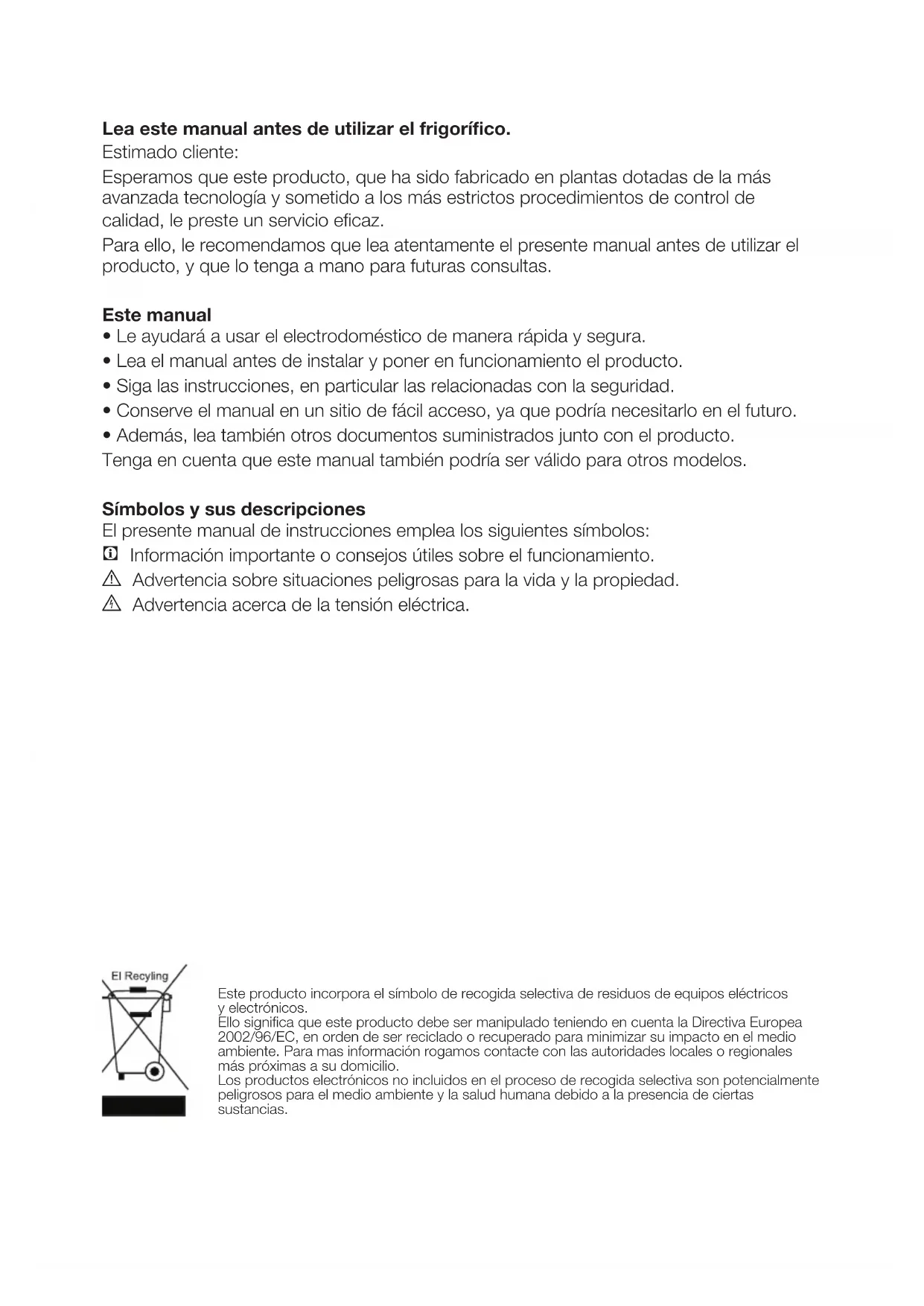 2002/96/EC, en orden de ser reciclado o recuperado para minimizar su impacto en el medio