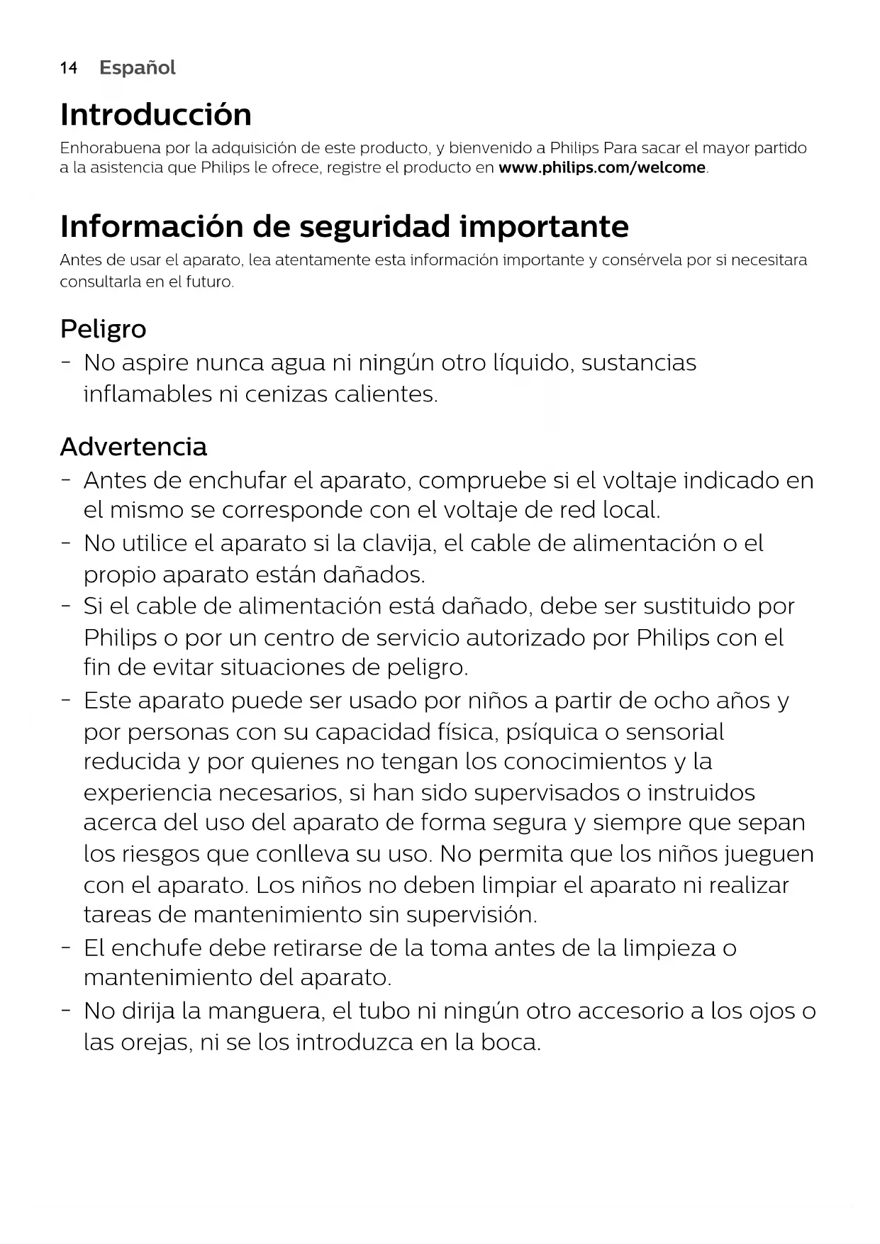 Introducción Enhorabuena por la adquisición de este producto, y bienvenido a Philips Para sacar el mayor partidoa la asistencia que Philips le ofrece, registre el producto en www.philips.com/welcome. Información de seguridad importante Antes de usar el aparato, lea atentamente esta información importante y consérvela por si necesitaraconsultarla en el futuro. Peligro