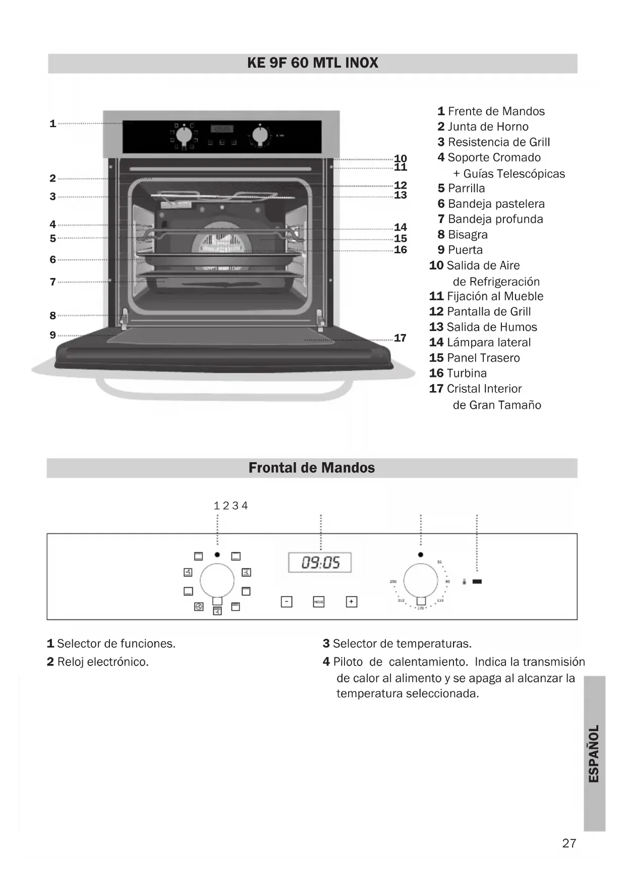Frontal de Mandos 1 Frente de Mandos 2 Junta de Horno 3 Resistencia de Grill 4 Soporte Cromado + Guías Telescópicas 5 Parrilla 6 Bandeja pastelera 7 Bandeja profunda 8 Bisagra 9 Puerta 10 Salida de Aire de Refrigeración 11 Fijación al Mueble 12 Pantalla de Grill 13 Salida de Humos 14 Lámpara lateral 15 Panel Trasero 16 Turbina 17 Cristal Interior de Gran Tamaño 1 Selector de funciones. 2 Reloj electrónico. 3 Selector de temperaturas. 4 Piloto de calentamiento. Indica la transmisión de calor al alimento y se apaga al alcanzar la temperatura seleccionada.