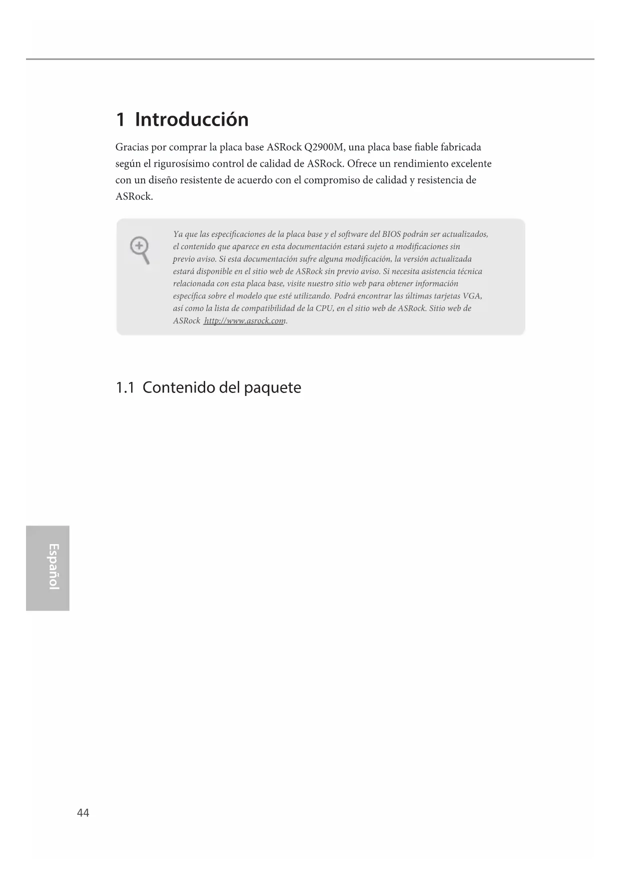 •1 escudo panel I/O Ya que las especicaciones de la placa base y el soware del BIOS podrán ser actualizados, el contenido que aparece en esta documentación estará sujeto a modicaciones sin previo aviso. Si esta documentación sufre alguna modicación, la versión actualizada estará disponible en el sitio web de ASRock sin previo aviso. Si necesita asistencia técnica relacionada con esta placa base, visite nuestro sitio web para obtener información especíca sobre el modelo que esté utilizando. Podrá encontrar las últimas tarjetas VGA, así como la lista de compatibilidad de la CPU, en el sitio web de ASRock. Sitio web de ASRock http://www.asrock.com.45