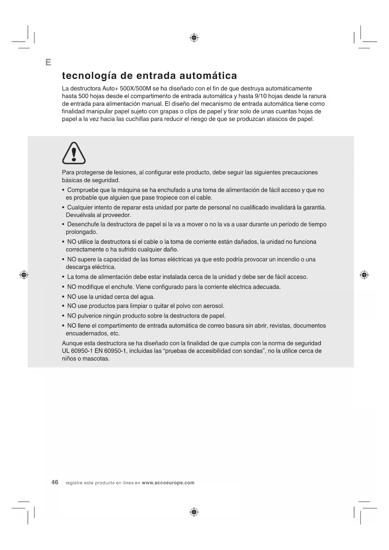 - Tenga en cuenta que las cuchillas se desgastarán progresivamente si destruyen hojas sujetas con grapas o clips para papel. En este caso, no estarán cubiertas por la garantía. La destructora Auto+ 500X ha sido diseñada para destruir un máximo de 50 tarjetas de crédito y 50 discos CD o DVD durante el período de garantía estándar de 2 años. Si destruye un número excesivo de tarjetas de crédito o discos CD o DVD, la garantía adicional para las cuchillas quedará invalidada. Todos los aspectos de estas condiciones estarán regidos y deberán interpretarse de acuerdo con la legislación inglesa y están sujetos a la jurisdicción exclusiva de los tribunales ingleses.54 registe este produto on-line em www.accoeurope.com