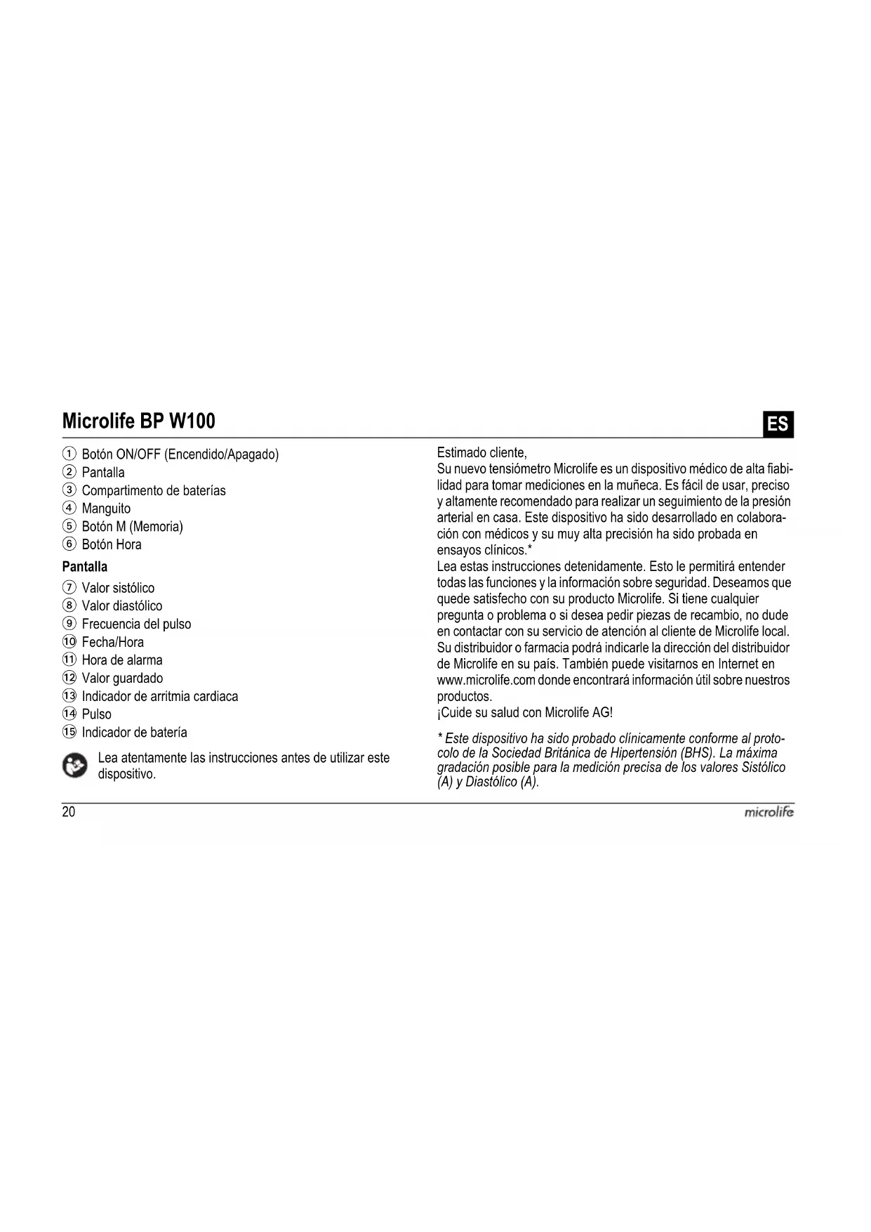 MANUAL DE USUARIO BP W100 MICROLIFE