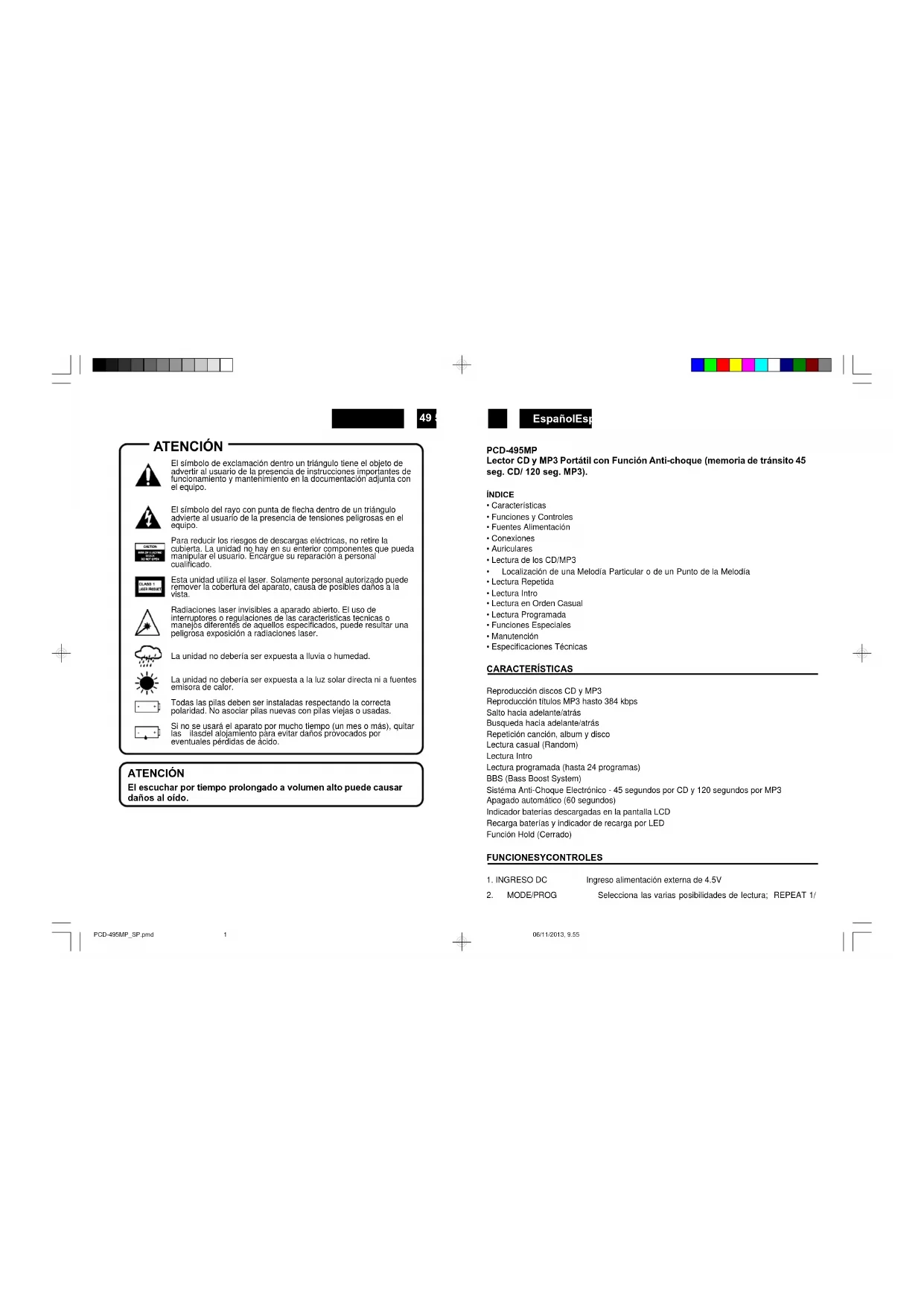 PCD-495MP Lector CD y MP3 Portátil con Función Anti-choque (memoria de tránsito 45 seg. CD/ 120 seg. MP3). ÍNDICE