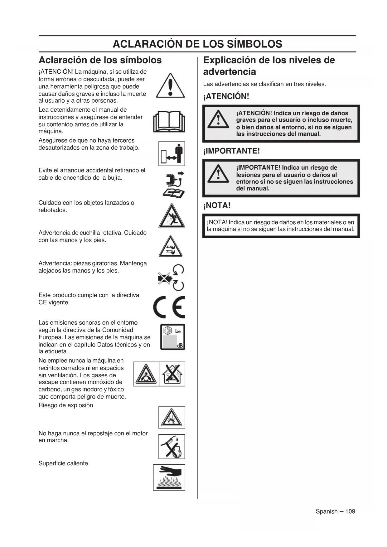 - 2005/88/CE 'modifica alla Direttiva 2000/14/CE' del 14 dicembre 2005 I valori per i livelli sonori dichiarati sono riportati nel capitolo relativo ai dati tecnici del manuale operatore. Sono state applicate le seguenti norme: ISO5395-1&2:2013; ISO3744, ISO11094; EN1032, EN1033; ISO14982; Procedimento di valutazione della conformità, allegato VIII. 20 aprile 2016 John Thompson, Direttore Marketing e Prodotti EUAP. (Rappresentante autorizzato per Husqvarna AB e responsabile della documentazione tecnica.)ACLARACIÓN DE LOS SÍMBOLOS Spanish – 109 Aclaración de los símbolos ¡ATENCIÓN! La máquina, si se utiliza de forma errónea o descuidada, puede ser una herramienta peligrosa que puede causar daños graves e incluso la muerte al usuario y a otras personas.Lea detenidamente el manual de instrucciones y asegúrese de entender su contenido antes de utilizar la máquina.Asegúrese de que no haya terceros desautorizados en la zona de trabajo.Evite el arranque accidental retirando el cable de encendido de la bujía.Cuidado con los objetos lanzados o rebotados.Advertencia de cuchilla rotativa. Cuidado con las manos y los pies.Advertencia: piezas giratorias. Mantenga alejados las manos y los pies.Este producto cumple con la directiva CE vigente.Las emisiones sonoras en el entorno según la directiva de la Comunidad Europea. Las emisiones de la máquina se indican en el capítulo Datos técnicos y en la etiqueta.No emplee nunca la máquina en recintos cerrados ni en espacios sin ventilación. Los gases de escape contienen monóxido de carbono, un gas inodoro y tóxico que comporta peligro de muerte.Riesgo de explosiónNo haga nunca el repostaje con el motor en marcha.Superficie caliente. Explicación de los niveles de advertencia Las advertencias se clasifican en tres niveles. ¡ATENCIÓN! ¡IMPORTANTE! ¡NOTA!
