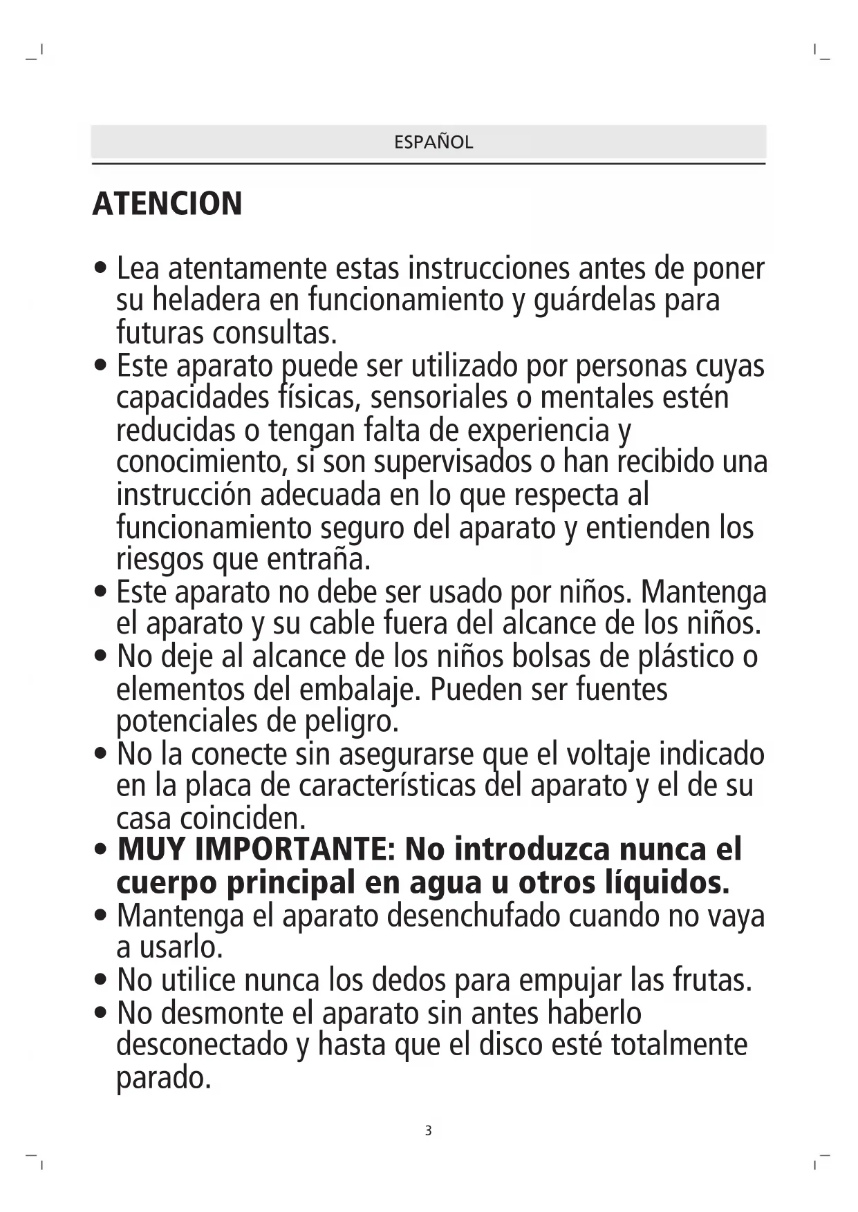 - Este aparato ha sido diseñado exclusivamente para uso doméstico. No debe mantenerlo en funcionamiento ininterrumpidamente por un períodos superiores a 2 minutos. Después de este período, déjelo reposar 1 minuto. Si la utiliza durante 3 ciclos consecutivos es conveniente dejarla reposar unos minutos.