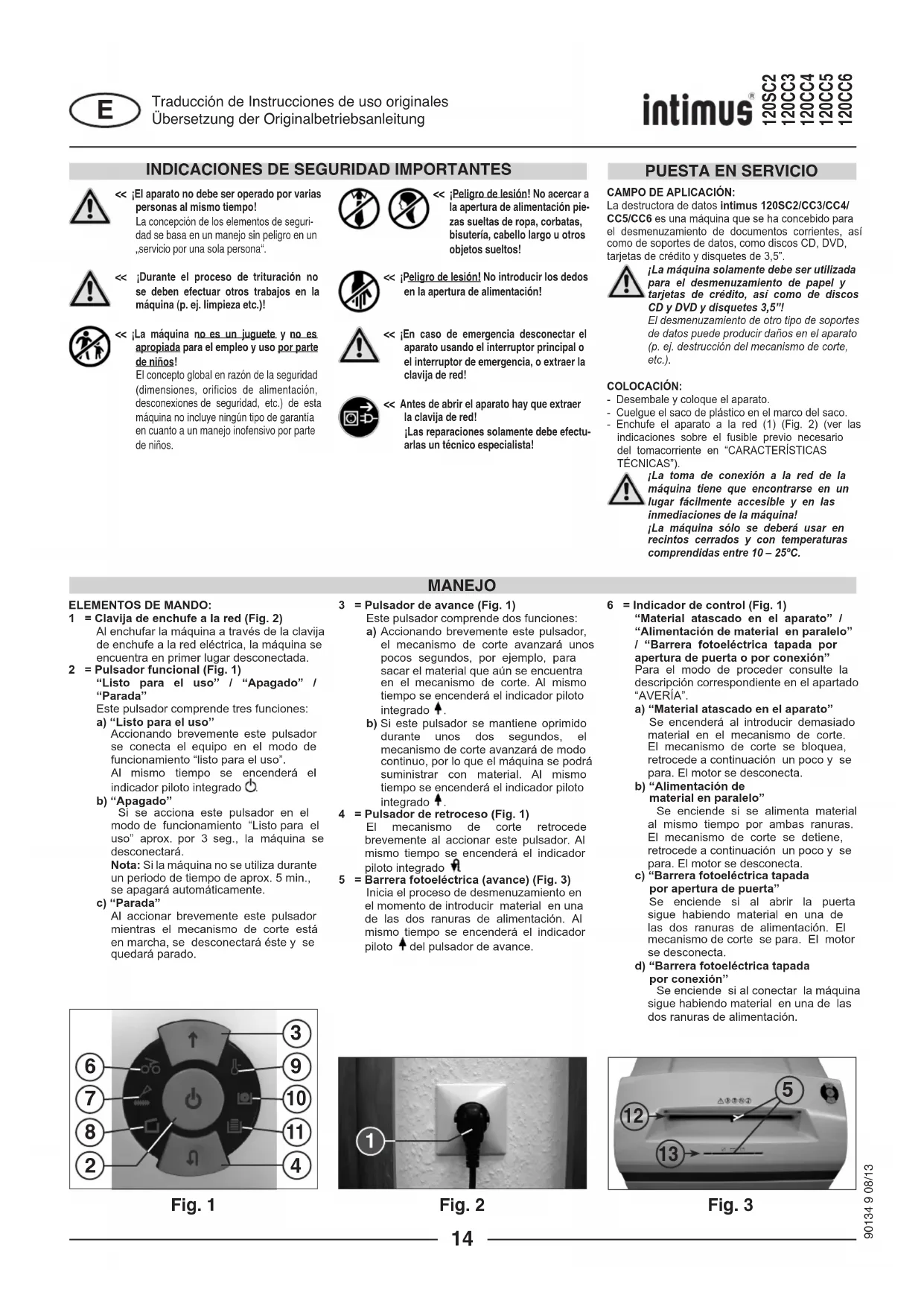 ELEMENTOS DE MANDO:1 = Clavija de enchufe a la red (Fig. 2) Al enchufar la máquina a través de la clavija de enchufe a la red eléctrica, la máquina se encuentra en primer lugar desconectada.2 = Pulsador funcional (Fig. 1) “Listo para el uso” / “Apagado” / “Parada” Este pulsador comprende tres funciones: a) “Listo para el uso” Accionando brevemente este pulsador se conecta el equipo en el modo de funcionamiento “listo para el uso”. Al mismo tiempo se encenderá el indicador piloto integrado . b) “Apagado” Si se acciona este pulsador en el modo de funcionamiento “Listo para el uso” aprox. por 3 seg., la máquina se desconectará. Nota: Si la máquina no se utiliza durante un periodo de tiempo de aprox. 5 min., se apagará automáticamente. c) “Parada” Al accionar brevemente este pulsador mientras el mecanismo de corte está en marcha, se desconectará éste y se quedará parado. 3 = Pulsador de avance (Fig. 1) Este pulsador comprende dos funciones: a) Accionando brevemente este pulsador, el mecanismo de corte avanzará unos pocos segundos, por ejemplo, para sacar el material que aún se encuentra en el mecanismo de corte. Al mismo tiempo se encenderá el indicador piloto integrado . b) Si este pulsador se mantiene oprimido durante unos dos segundos, el mecanismo de corte avanzará de modo continuo, por lo que el máquina se podrá suministrar con material. Al mismo tiempo se encenderá el indicador piloto integrado .4 = Pulsador de retroceso (Fig. 1) El mecanismo de corte retrocede brevemente al accionar este pulsador. Al mismo tiempo se encenderá el indicador piloto integrado .5 = Barrera fotoeléctrica (avance) (Fig. 3) Inicia el proceso de desmenuzamiento en el momento de introducir material en una de las dos ranuras de alimentación. Al mismo tiempo se encenderá el indicador piloto del pulsador de avance.6 = Indicador de control (Fig. 1) “Material atascado en el aparato” / “Alimentación de material en paralelo” / “Barrera fotoeléctrica tapada por apertura de puerta o por conexión” Para el modo de proceder consulte la descripción correspondiente en el apartado “AVERÍA”. a) “Material atascado en el aparato” Se encenderá al introducir demasiado material en el mecanismo de corte. El mecanismo de corte se bloquea, retrocede a continuación un poco y se para. El motor se desconecta. b) “Alimentación de material en paralelo” Se enciende si se alimenta material al mismo tiempo por ambas ranuras. El mecanismo de corte se detiene, retrocede a continuación un poco y se para. El motor se desconecta. c) “Barrera fotoeléctrica tapada por apertura de puerta” Se enciende si al abrir la puerta sigue habiendo material en una de las dos ranuras de alimentación. El mecanismo de corte se para. El motor se desconecta. d) “Barrera fotoeléctrica tapada por conexión” Se enciende si al conectar la máquina sigue habiendo material en una de las dos ranuras de alimentación.Traducción de Instrucciones de uso originalesÜbersetzung der OriginalbetriebsanleitungLa destructora no se debe utilizar nunca como asiento ni como taburete. ¡Peligro de caída por rotura de material!CÓMO CONECTAR EL APARATO:Para conectar el aparato en “listo para el uso” proceda como sigue:- Accione brevemente el pulsador funcional (2).- El indicador piloto del pulsador funcional (2) se encenderá para la función “Listo para el uso”. - A continuación se puede empezar a alimentar el aparato con papel.ALIMENTACIÓN DE MATERIAL:Introduzca papel por la ranura de alimentación de papel (12) (Fig. 3) al mecanismo de corte.Introduzca los soportes de datos (CD, DVD o tarjeta de crédito), uno a uno, por la ranura de alimentación de CD/DVD, dispuesta separadamente, (13) (Fig. 3) al mecanismo de corte. El aparato se conecta automáticamente a la marcha de avance, mete el material y se desconecta automáticamente después de haber nalizado la etapa de desmenuzamiento.¡Mientras se introduzca papel no se deberá introducir nunca al mismo tiempo CD/DVD o a la inversa!Notas: Para el desmenuzamiento de láminas transparentes se tiene que conectar la máquina a mano en el modo de funcionamiento de avance (mantenga accionado el pulsador de avance (3) durante unos 2 segundos).Accionando brevemente el pulsador funcional (2) (función de “Parada”) se puede detener en todo momento la etapa de desmenuzamiento. Para continuar, mantenga accionado el pulsador de avance (3) durante 2 segundos.Si la máquina no se utiliza durante un periodo de tiempo de aprox. 5 min. se desconecta. ¡No introduzca nunca en el aparato más material del indicado como máximo (consulte el apartado “DATOS TÉCNICOS”)!En el caso de que se haya introducido de todos modos demasiado material en el mecanismo de corte, consulte en “AVERÍAS” en el apartado “MATERIAL ATASCADO EN EL APARATO”.El recipiente recolector tiene dos compartimentos separadosque sirvenpara clasicarcorrectamentelas basura.CÓMO VACIAR EL SACO RECOLECTORPARA PAPEL (Fig. 4):En cuanto el saco recolector se haya llenado de papel, el aparato se desconectará. El indicador de control (11) se enciende. Proceda como sigue:- Abra la puerta. El indicador de control (8) se enciende. Si aún queda material en una de las ranuras de alimentación, el indicador de control (6) se encenderá también ahora.ELEMENTOS DE MANDO:7 = Indicador de control (Fig. 1) “Engrasar mecanismo de corte” Se enciende cuando el mecanismo de corte de la versión Cross-Cut (cruzado) se tiene que engrasar. El proceso de engrase se tiene que conrmar con el pulsador de retroceso (4) (ver descripción en “MANTENIMIENTO DEL MECANISMO DE CORTE”).8 = Indicador de control (Fig. 1) “Puerta abierta” / “Avería eléctrica” a) “Puerta abierta” Se enciende si la puerta del armario inferior está abierta. El aparato se desconecta automáticamente y no se puede conectar mientras la puerta siga estando abierta. b) “Avería eléctrica” parpade