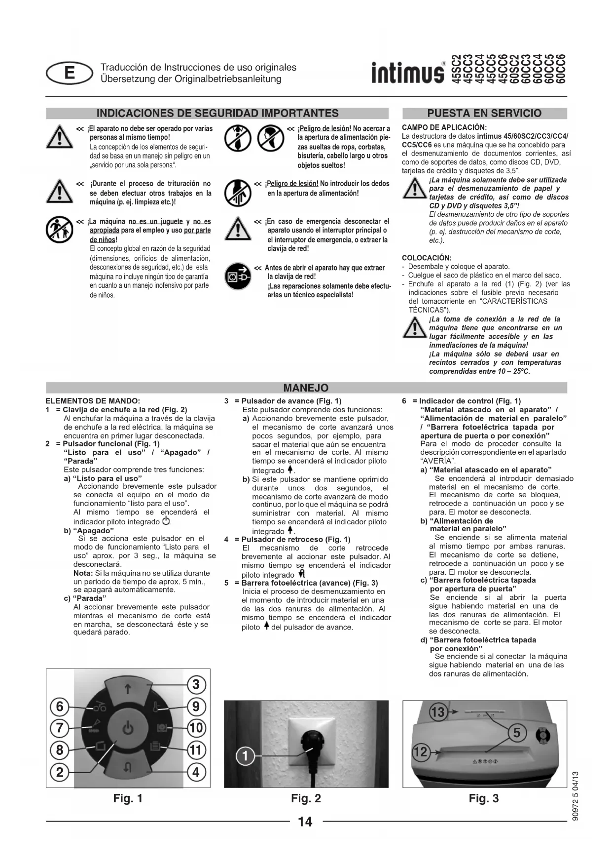 Traducción de Instrucciones de uso originalesÜbersetzung der Originalbetriebsanleitung 15MATERIAL ATASCADO EN EL APARATO:(Función de auto-retroceso)Si se produce un atasco debido a un exceso de material introducido, el aparato reacciona como sigue: - El mecanismo de corte se bloquea, retrocede a continuación un poco (material se libera) y se para. El motor se desconecta. El indicador de control (6) se enciende.Proceda como sigue:Papel atascado en la ranura de alimentación de papel (12)- Retire el papel retrocedido.- Una vez hecho esto, el mecanismo de corte avanzará automáticamente y desmenuzará el resto de papel contenido en el mecanismo de corte. El indicador piloto integrado del pulsador de avance (3) está encendido durante el avance. El indicador de control (6) se apaga.- Continúe con el desmenuzamiento introduciendo una cantidad menor de papel.Material atascado en la ranura de alimentación de CD/DVD (13) - Retire el material retrocedido.¡Retire el material con sumo cuidado, porque se puede cortar en los puntos alados de corte!- A continuación, el material restante se vuelve a transportar automáticamente al mecanismo de corte y se desmenuza. El indicador piloto integrado del pulsador de avance (3) está encendido durante el avance. El indicador de control (6) se apaga.- En cuanto el material haya pasado por el mecanismo de corte, podrá seguir con el desmenuzamiento pero dosicando correctamente. - Si fuera necesario, conecte el mecanismo de corte a mano, alternando entre avance y retroceso, hasta que el material haya pasado por el mecanismo de corte y se haya desmenuzado.ALIMENTACIÓN DE MATERIAL EN PARALELO:Si se introduce material por ambas ranuras de alimentación, la máquina reaccionará como sigue:- El mecanismo de corte se bloquea, retrocede a continuación un poco (material se libera) y se para. El motor se desconecta. El indicador de control (6) se enciende.- Retire el material de una de las ranuras.- Accione brevemente el pulsador de avance (3). El material restante de la otra ranura se introducirá en el mecanismo de corte para ser desmenuzado. El indicador de control (6) se apaga.BARRERA FOTOELÉCTRICA TAPADA POR APERTURA DE PUERTA: Si al abrir la puerta se encontrara aún material en una de las ranuras de alimentación, el motor se desconectará y el mecanismo de corte se parará. El indicador de control (6) se enciende.Cierre la puerta y conrme la situación accionando brevemente el pulsador de avance (3). El material restante se introducirá en el mecanismo de corte para ser desmenuzado.BARRERA FOTOELÉCTRICA TAPADA POR CONEXIÓN:Si al conectar la máquina hubiera material en una de las ranuras de alimentación, el indicador de control se enciende (6).Retire el material y conrme la situación accionando brevemente el pulsador de avance (3).GUARDAMOTOR: Si el motor se sobrecarga, se desconectará. El indicador de control (9) se enciende. Deje enfriar el aparato unos 25-40 minutos (en función del modelo y temperatura ambiental) y vuelva a activar entonces el aparato.AVERÍA ELÉCTRICA: Si el indicador de control (9) parpadea en combinación con el indicador piloto del interruptor funcional (2) o sólo el indicador de control (8), signica que ha surgido una avería eléctrica. Con lo que el aparato no se puede activar.Avise en este caso al comercio especializado más cercano.LISTA DE VERIFICACIÓN EN LAS AVERÍAS:Si el aparato no funciona, compruebe los siguientes puntos: - ¿Se ha conectado la clavija de enchufe a la red de corriente eléctrica?- ¿Está la puerta cerrada?- ¿Esta el saco recolector de papel lleno? Siga las instrucciones en el apartado “CÓMO VACIAR EL SACO RECOLECTOR”.- ¿Está el recipiente recolector para CD/DVD lleno? Siga las instrucciones en el apartado “CÓMO VACIAR EL RECIPIENTE RECOLECTOR PARA CD/DVD”.- ¿Hay material atascado en el aparato? Siga las instrucciones en el apartado “MATERIAL ATASCADO EN EL APARATO”.- ¿Se ha sobrecargado el motor? Consulte el apartado “GUARDAMOTOR”.Si su aparato presenta otro problema distinto a los alistados anteriormente, notifíquelo al comercio especializado más cercano. Fig. 5 Fig. 690972 5 04/13 45SC2 45CC3 45CC4 45CC5 45CC6 60SC2 60CC3 60CC4 60CC5 60CC6