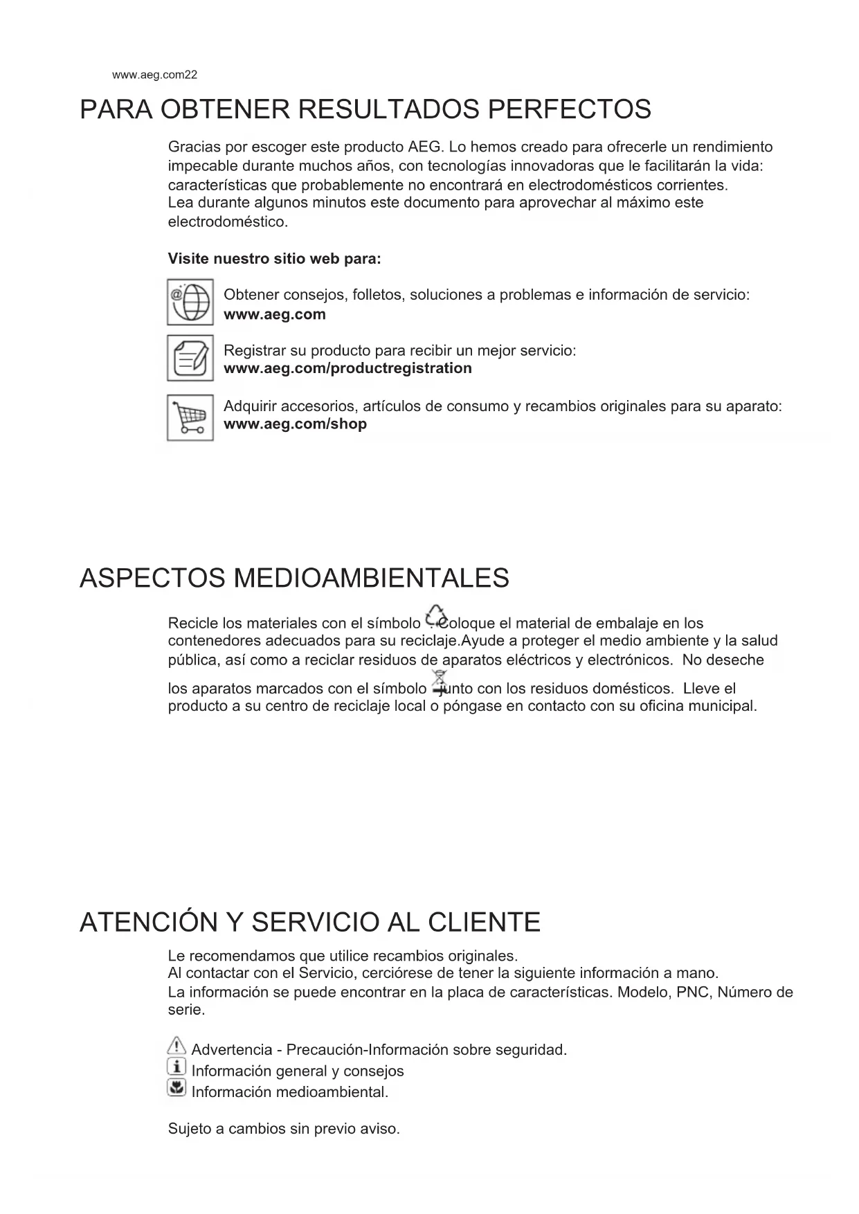 PARA OBTENER RESULTADOS PERFECTOS Gracias por escoger este producto AEG. Lo hemos creado para ofrecerle un rendimiento