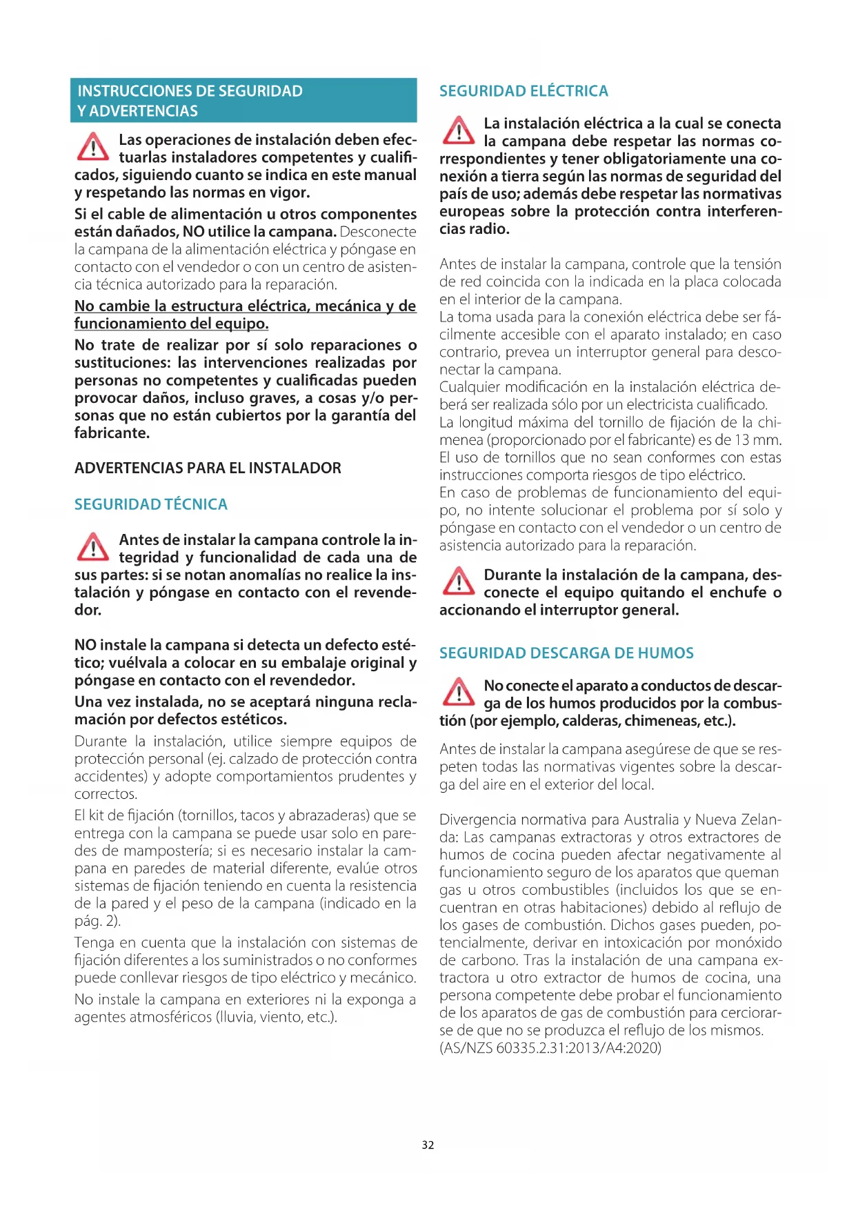 ADVERTENCIAS PARA EL INSTALADOR SEGURIDAD TÉCNICA Antes de instalar la campana controle la in-