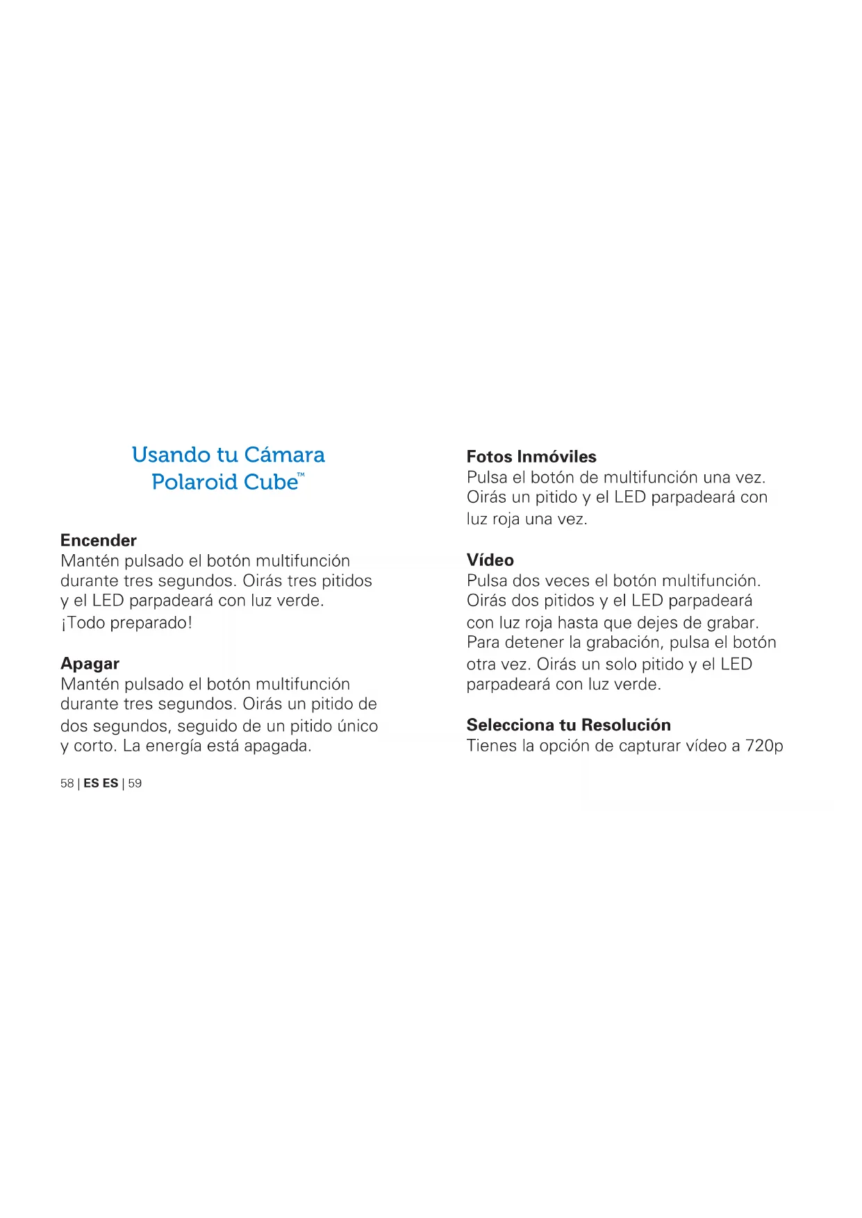 658 | ES ES | 59 Fotos Inmóviles Pulsa el botón de multifunción una vez. Oirás un pitido y el LED parpadeará con luz roja una vez. Vídeo Pulsa dos veces el botón multifunción. Oirás dos pitidos y el LED parpadeará con luz roja hasta que dejes de grabar. Para detener la grabación, pulsa el botón otra vez. Oirás un solo pitido y el LED parpadeará con luz verde. Selecciona tu Resolución Tienes la opción de capturar vídeo a 720p Usando tu Cámara Polaroid Cube