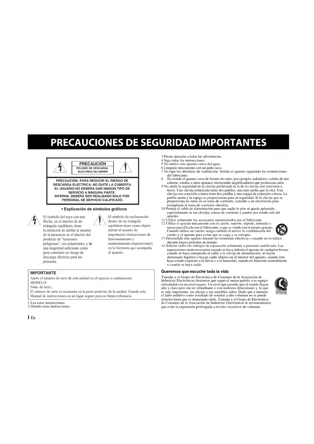 184 mmi Es 1 Lea estas instrucciones.2 Guarde estas instrucciones.3 Preste atención a todas las advertencias.4 Siga todas las instrucciones.5 No utilice este aparato cerca del agua.6 Límpielo únicamente con un paño seco.7 No tape las aberturas de ventilación. Instale el aparato siguiendo las instrucciones del fabricante. 8 No instale el aparato cerca de fuentes de calor, por ejemplo, radiadores, salidas de aire caliente, estufas u otros aparatos (incluyendo amplificadores) que produzcan calor.9 No anule la seguridad de la clavija polarizada ni la de la clavija con conexión a tierra. Una clavija polarizada tiene dos patillas, una más ancha que la otra. Una clavija con conexión a tierra tiene dos patillas y una espiga de conexión a tierra. La patilla ancha y la espiga se proporcionan para su seguridad. Si la clavija que se proporciona no entra en su toma de corriente, consulte a un electricista para reemplazar la toma de corriente obsoleta.10 Proteja el cable de alimentación para que nadie lo pise ni quede aplastado, especialmente en las clavijas, tomas de corriente y puntos por donde sale del aparato.11 Utilice solamente los accesorios suministrados por el fabricante.12 Utilice el aparato únicamente con el carrito, soporte, trípode, ménsula o mesa especificado por el fabricante, o que se vende con el propio aparato. Cuando utilice un carrito, tenga cuidado al mover la combinación del carrito y el aparato para evitar que se caiga y se estropee.13 Desenchufe este aparato durante las tormentas eléctricas o cuando no lo utilice durante largos periodos de tiempo.14 Solicite todos los trabajos de reparación solamente a personal cualificado. Las reparaciones serán necesarias cuando se haya dañado el aparato de cualquier forma: cuando se haya estropeado el cable o la clavija de alimentación, se hayan derramado líquidos o hayan caído objetos en el interior del aparato, cuando éste haya estado expuesto a la lluvia o a la humedad, cuando no funcione normalmente o cuando se haya caído. Queremos que escuche toda la vida Yamaha y el Grupo de Electrónica de Consumo de la Asociación de Industrias Electrónicas deseamos que saque el mejor partido a su equipo utilizándolo en un nivel seguro. Un nivel que permite que el sonido llegue alto y claro pero sin ser retumbante o con molestas distorsiones y, lo que es más importante, sin afectar a sus sensibles oídos. Dado que a menudo el daño auditivo como resultado de sonidos a alto volumen no se puede detectar hasta que es demasiado tarde, Yamaha y el Grupo de Electrónica de Consumo de la Asociación de Industrias Electrónicas le recomendamos que evite la exposición prolongada a niveles excesivos de volumen.